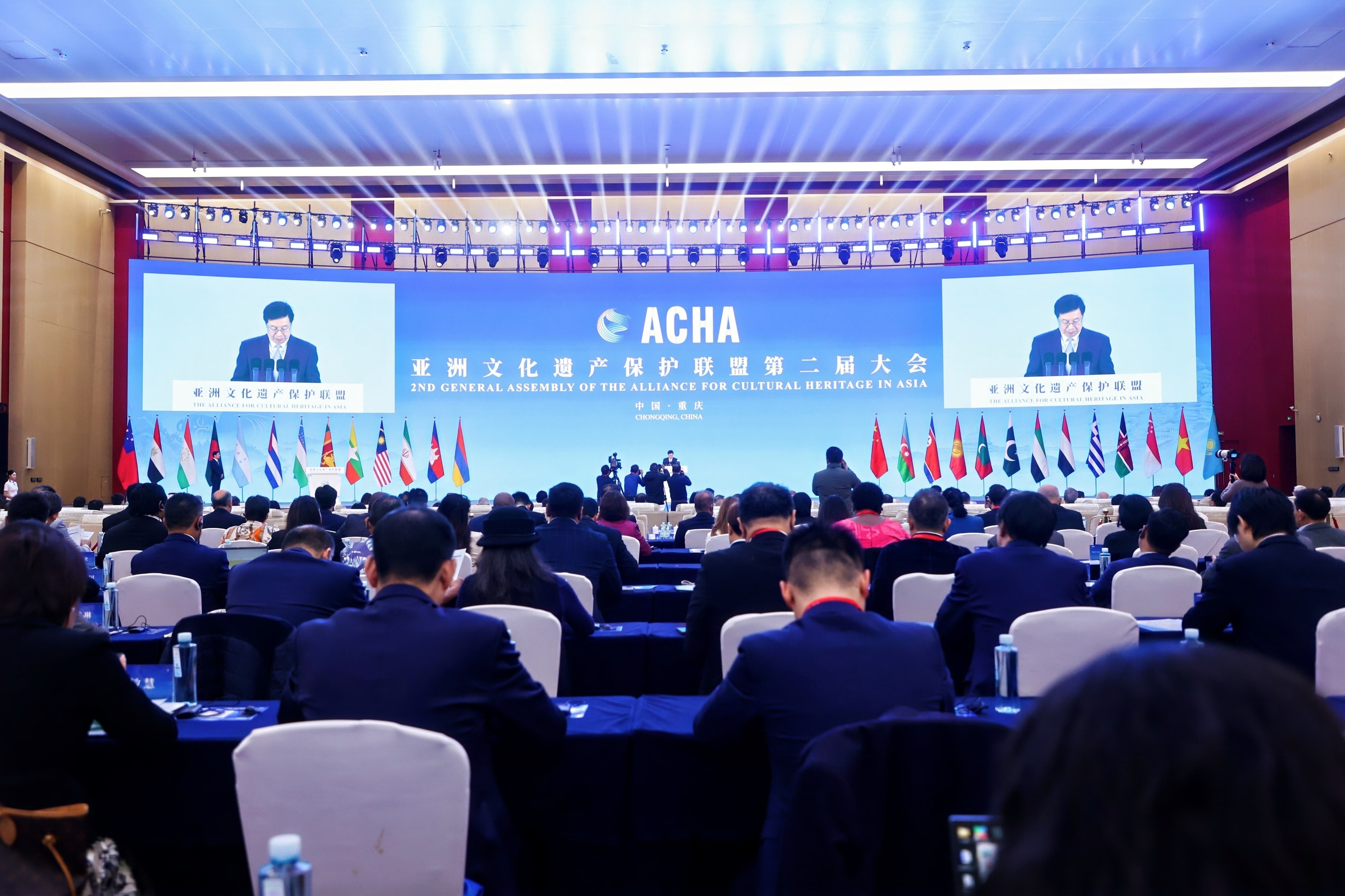 本次会议由国家文物局、重庆市人民政府、亚洲文化遗产保护联盟共同主办,来自33个国家及国际组织的代表出席会议。中国文化和旅游部部长孙业礼,重庆市委副书记、市政府市长胡衡华,伊朗文化遗产、旅游和手工业部部长萨利希·阿米里,马尔代夫迪维希语、文化和遗产部部长阿达姆·纳西尔·易卜拉欣,塔吉克斯坦文化部部长萨托里约恩·马特卢巴洪,埃及最高文物委员会秘书长穆罕默德·伊斯玛仪·哈利德等出席大会并致辞。中国文化和旅游部副部长、国家文物局局长饶权主持会议并作主旨发言。