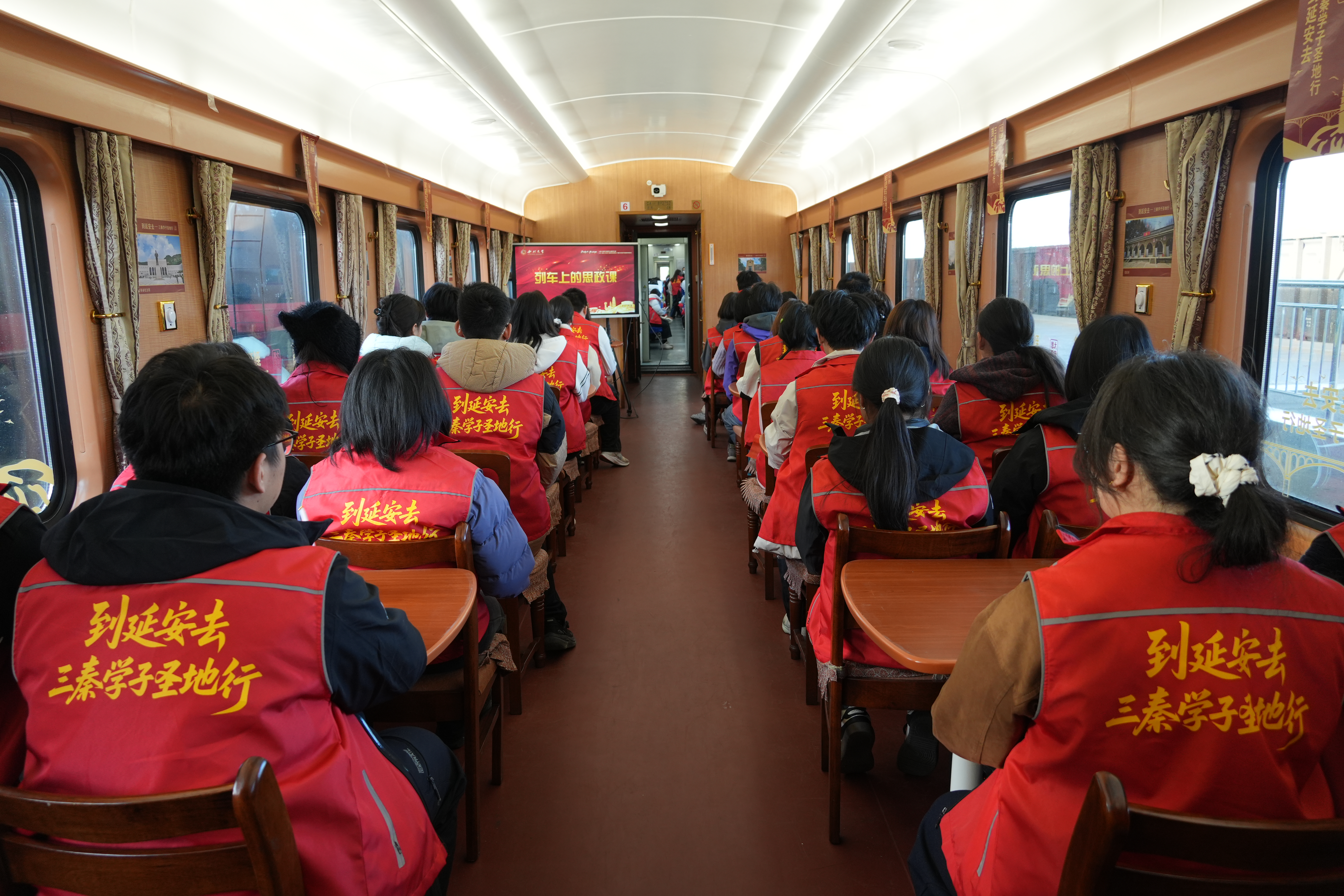 实践研学的序幕,在“西铁红色教育专列”上正式拉开。列车疾驰途中,主题宣讲、知识问答、红歌互动等活动轮番上演,沉浸式学习让车厢变成“行走的思政课堂”,学员们在红色旋律与思想碰撞中,提前感受延安精神的厚重底蕴。