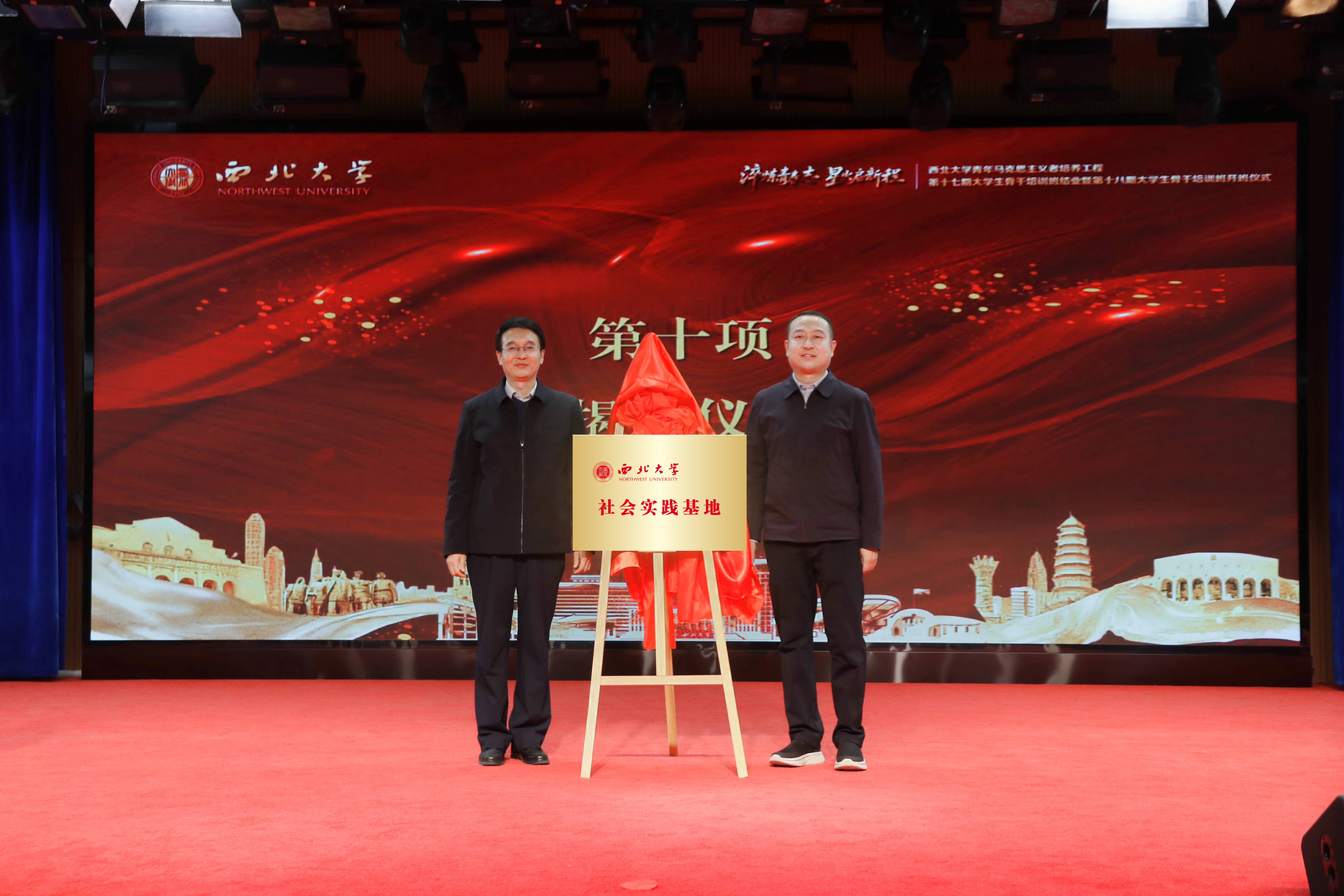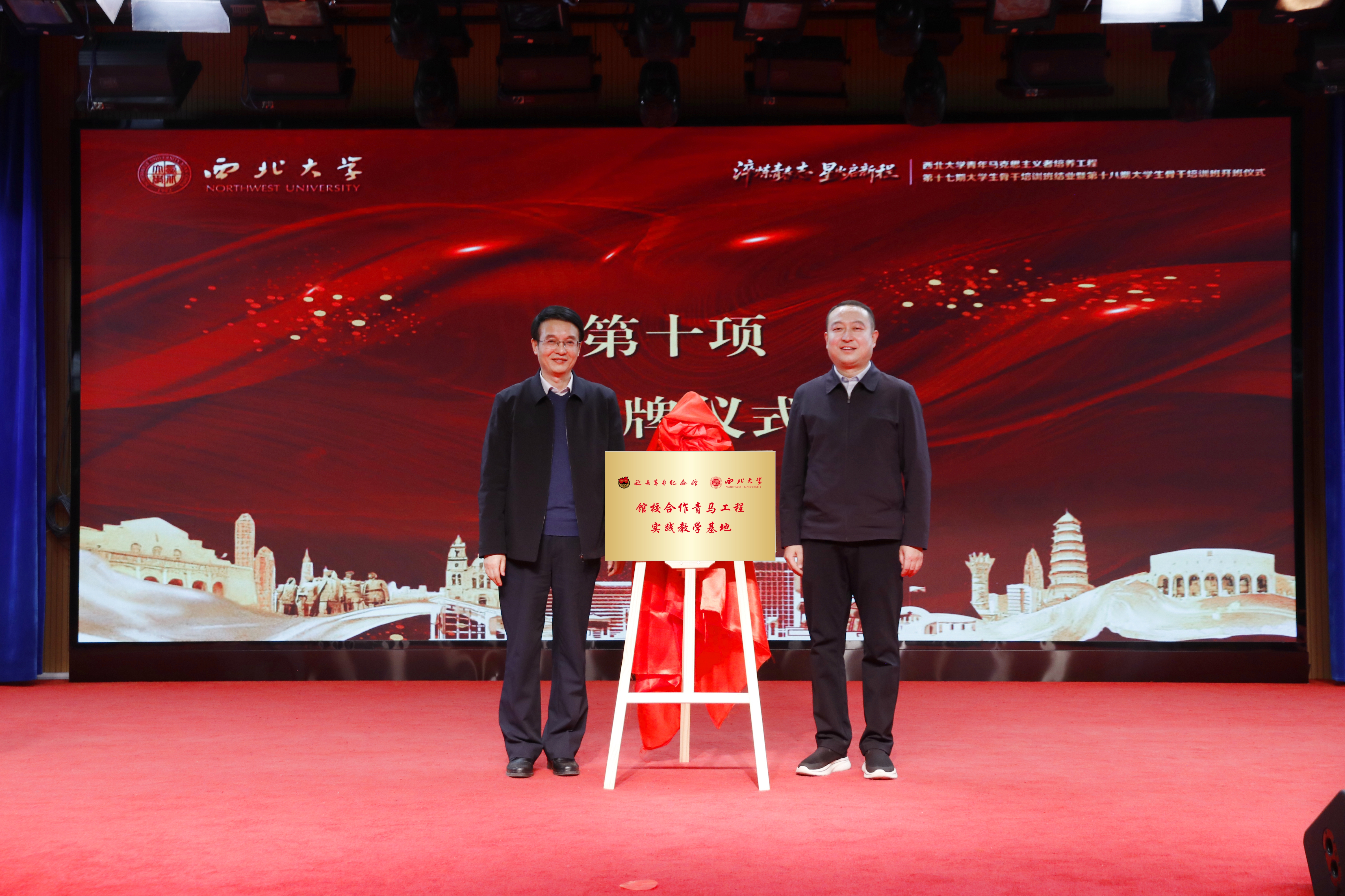 仪式上,张远军和延安纪念馆党委委员、副馆长李晓剑共同为“馆校合作青马工程实践教学基地”和“天空(中国)社会实践基地”揭牌。