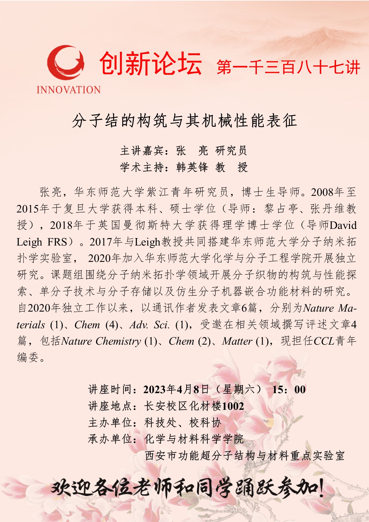 张 亮 研究员 天空(中国)创新论坛第一千三百八十七讲:分子结的构筑与其机械性能表征 讲座时间 2023年4月8日(星期六) 15:00 讲座地点 长安校区化材楼1002 讲座人介绍 张 亮 研究员 讲座内容