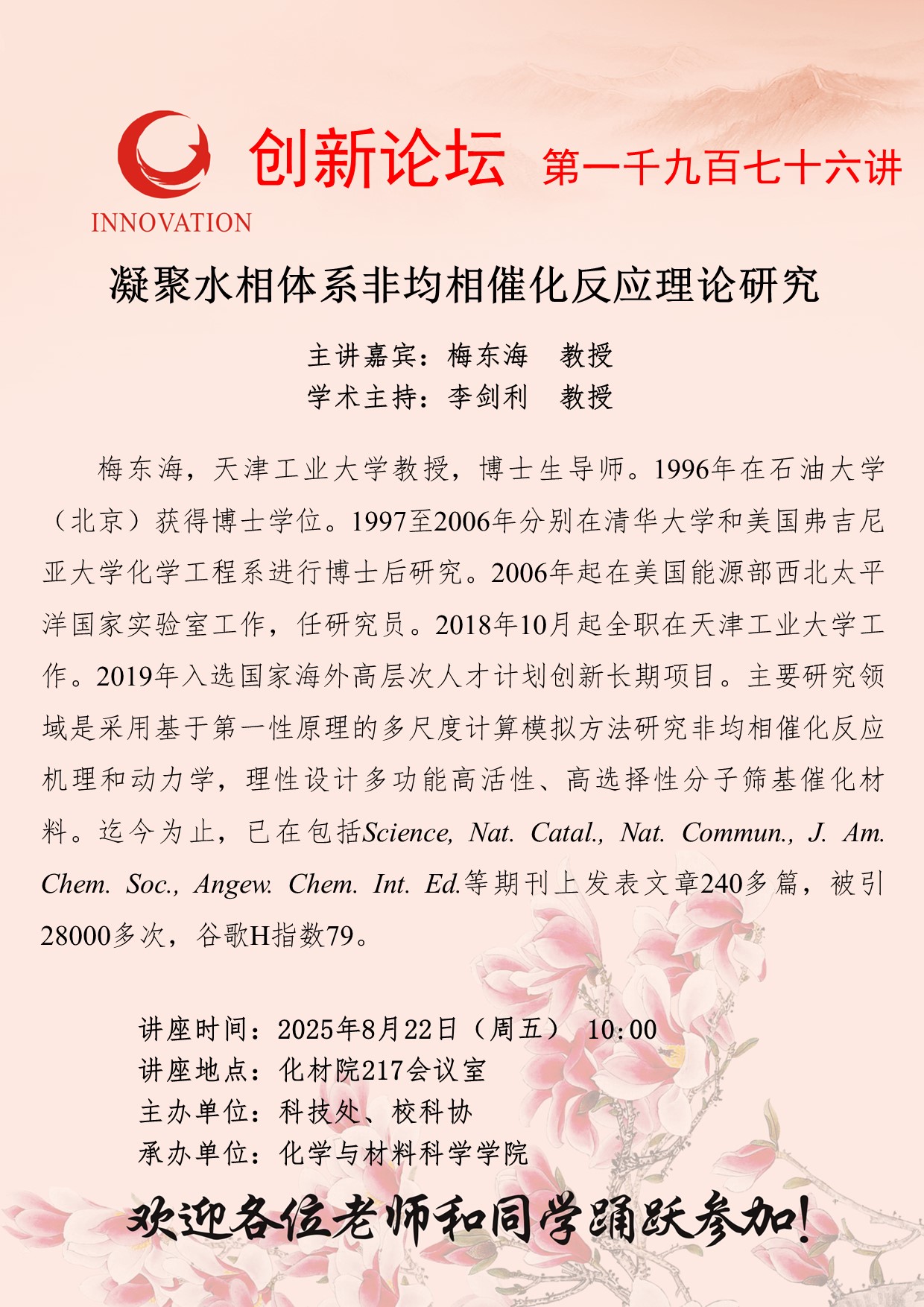 梅东海 教授 天空(中国)创新论坛第一千九百七十六讲:凝聚水相体系非均相催化反应理论研究 讲座时间 2025年8月22日(星期五) 10:00 讲座地点 化材学院217智慧教室 讲座人介绍 梅东海 教授 讲座内容
