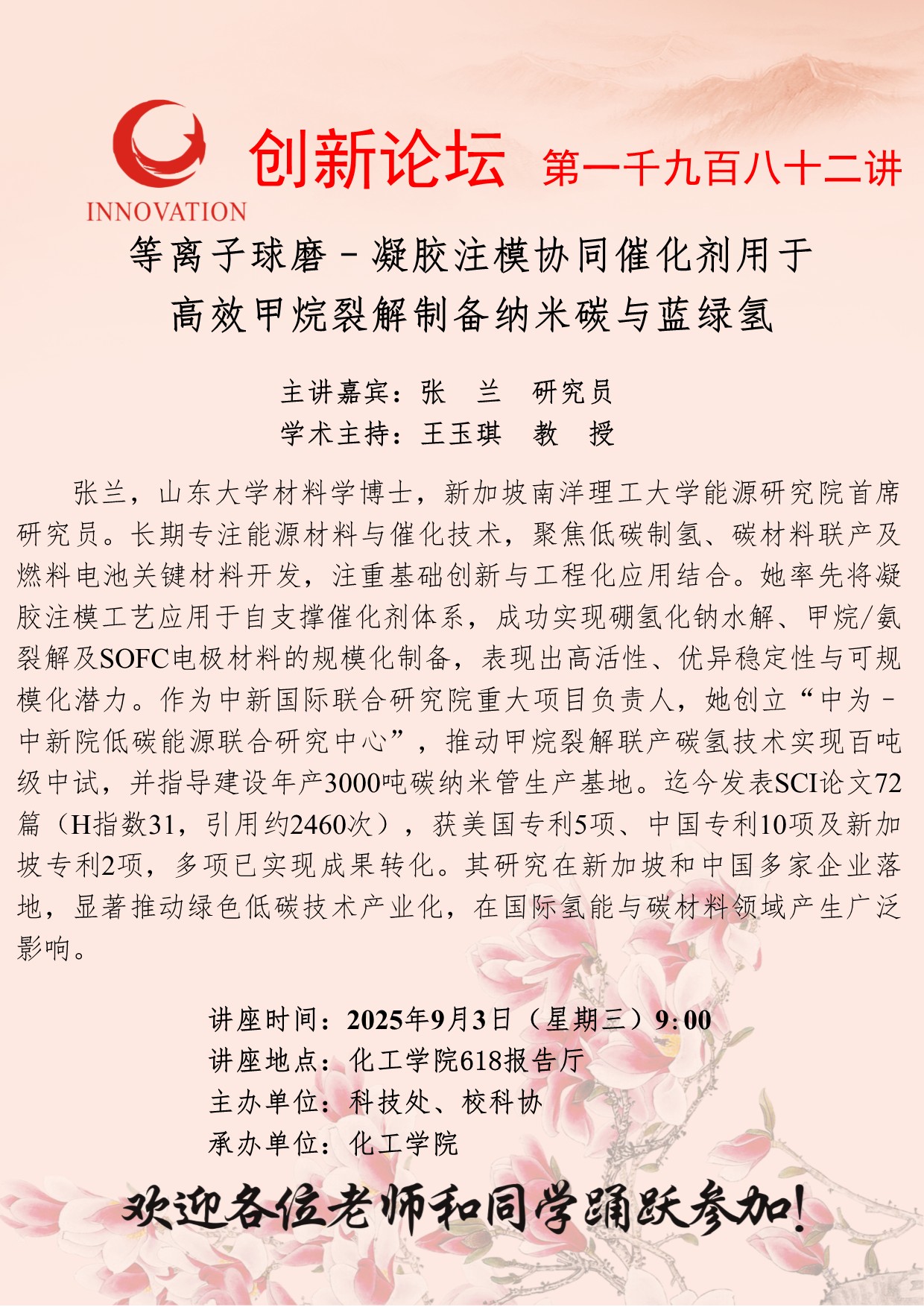 张兰 研究员 天空(中国)创新论坛第一千九百八十二讲:等离子球磨–凝胶注模协同催化剂用于高效甲烷裂解制备纳米碳与蓝绿氢 讲座时间 2025年9月3日(星期三)9:00 讲座地点 化工学院618报告厅 讲座人介绍 张兰 研究员 讲座内容