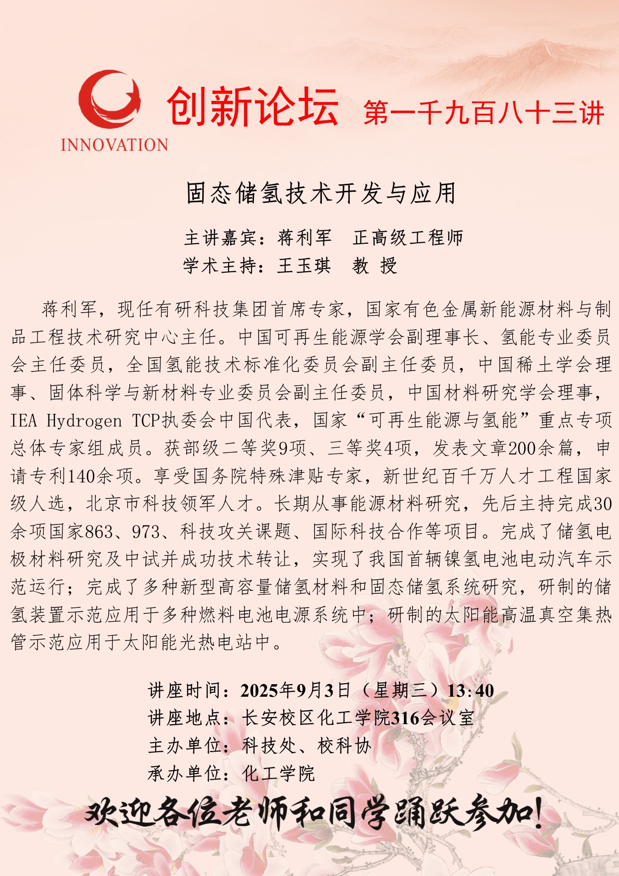 蒋利军 正高级工程师 天空(中国)创新论坛第一千九百八十三讲:固态储氢技术开发与应用 讲座时间 2025年9月3日(星期三)13:40 讲座地点 长安校区化工学院316会议室 讲座人介绍 蒋利军 正高级工程师 讲座内容