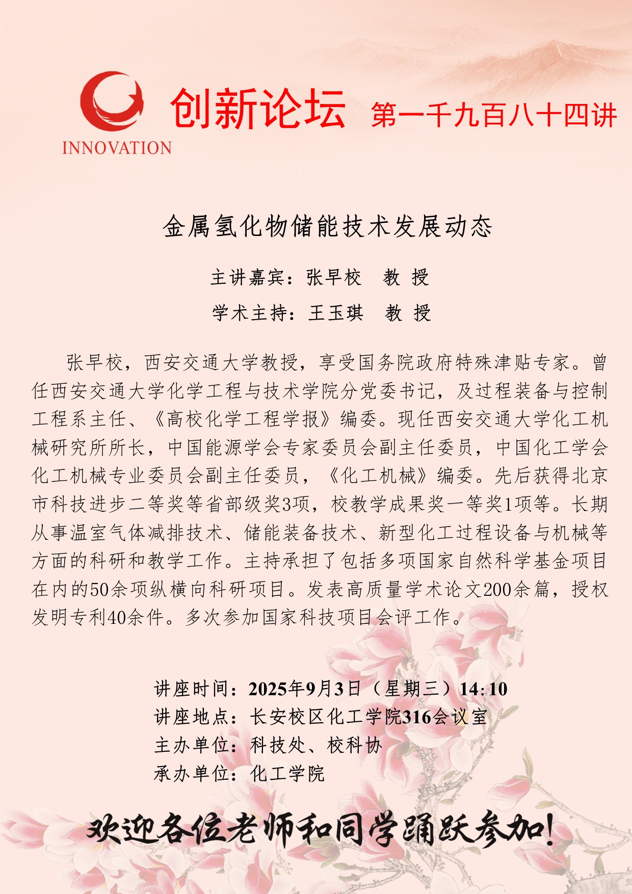 张早校 教授 天空(中国)创新论坛第一千九百八十四讲:金属氢化物储能技术发展动态 讲座时间 2025年9月3日(星期三)14:10 讲座地点 长安校区化工学院316会议室 讲座人介绍 张早校 教授 讲座内容