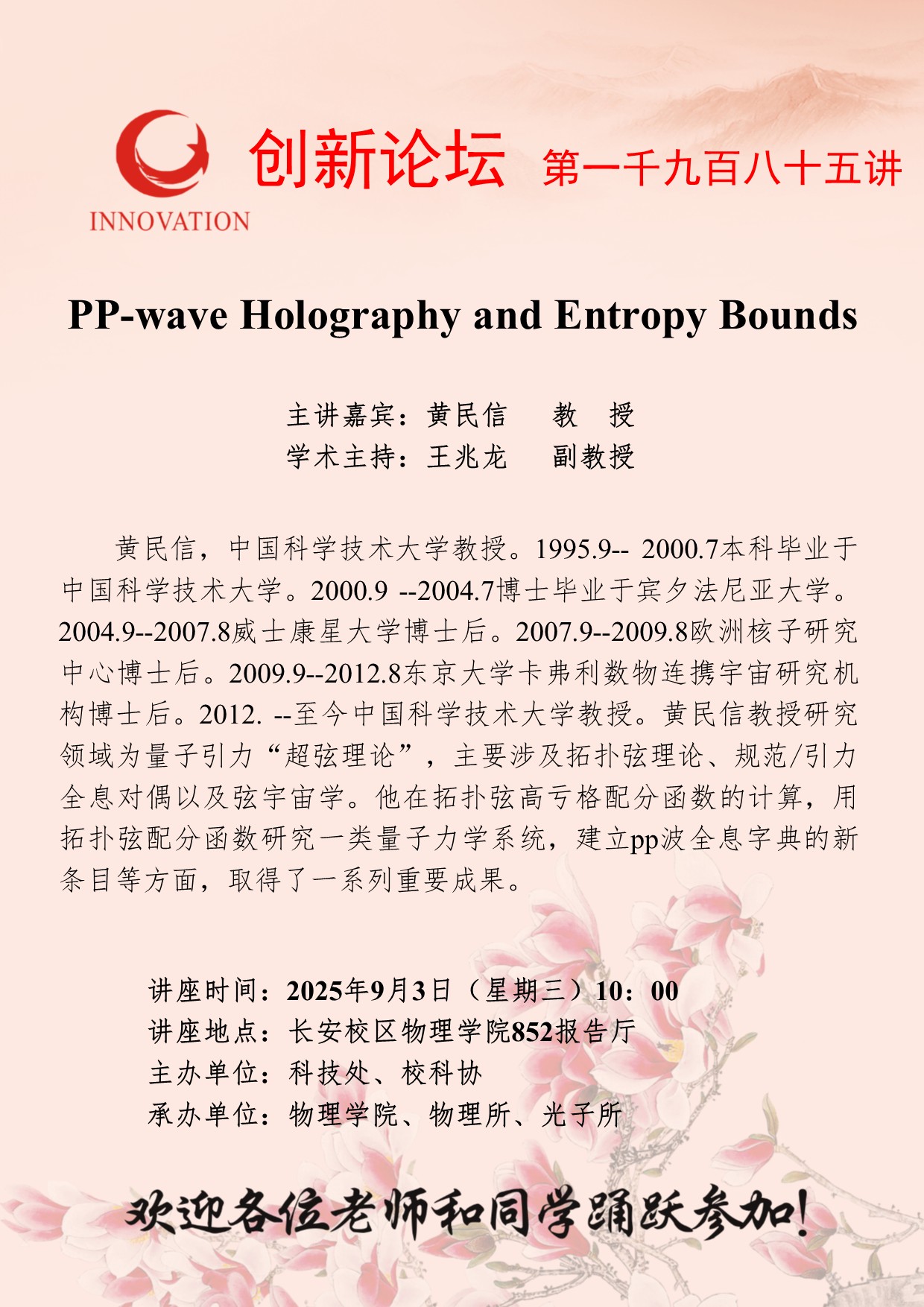 黄民信 教授 天空(中国)创新论坛第一千九百八十五讲:PP-wave Holography and Entropy Bounds 讲座时间 2025年9月3日(星期三)10:00 讲座地点 长安校区物理学院852报告厅 讲座人介绍 黄民信 教授 讲座内容