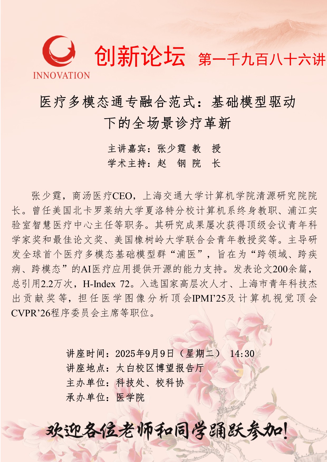 张少霆 教 授 天空(中国)创新论坛第一千九百八十六讲:医疗多模态通专融合范式:基础模型驱动下的全场景诊疗革新 讲座时间 2025年9月9日(星期二) 14:30 讲座地点 太白校区博望报告厅 讲座人介绍 张少霆 教 授 讲座内容 fu