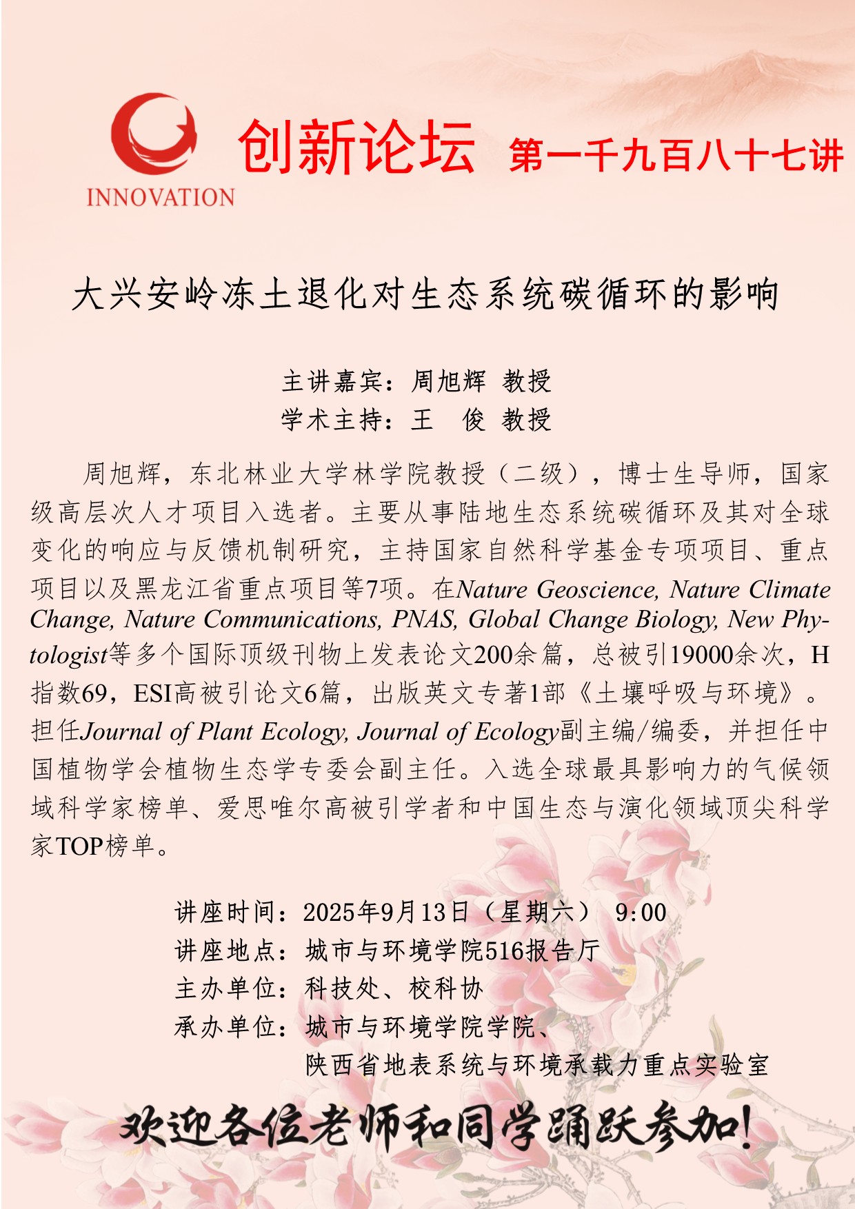 周旭辉 教授 天空(中国)创新论坛第一千九百八十七讲:大兴安岭冻土退化对生态系统碳循环的影响 讲座时间 2025年9月13日(星期六) 讲座地点 城市与环境学院516报告厅 讲座人介绍 周旭辉 教授 讲座内容