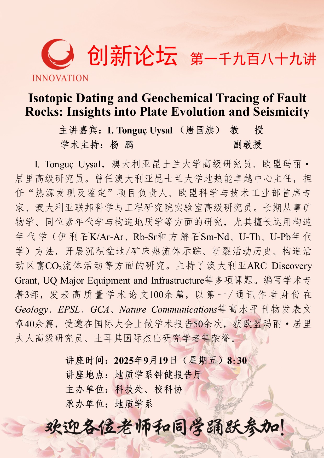 I. Tonguç Uysal 教授 天空(中国)创新论坛第一千九百八十九讲:Isotopic Dating and Geochemical Tracing of Fault Rocks: Insights into Plate Evolution and Seismicity 讲座时间 2025年9月19日(星期五)8:30 讲座地点 地质学系钟健报告厅 讲座人介绍 I. Tonguç Uysal 教授 讲座内容
