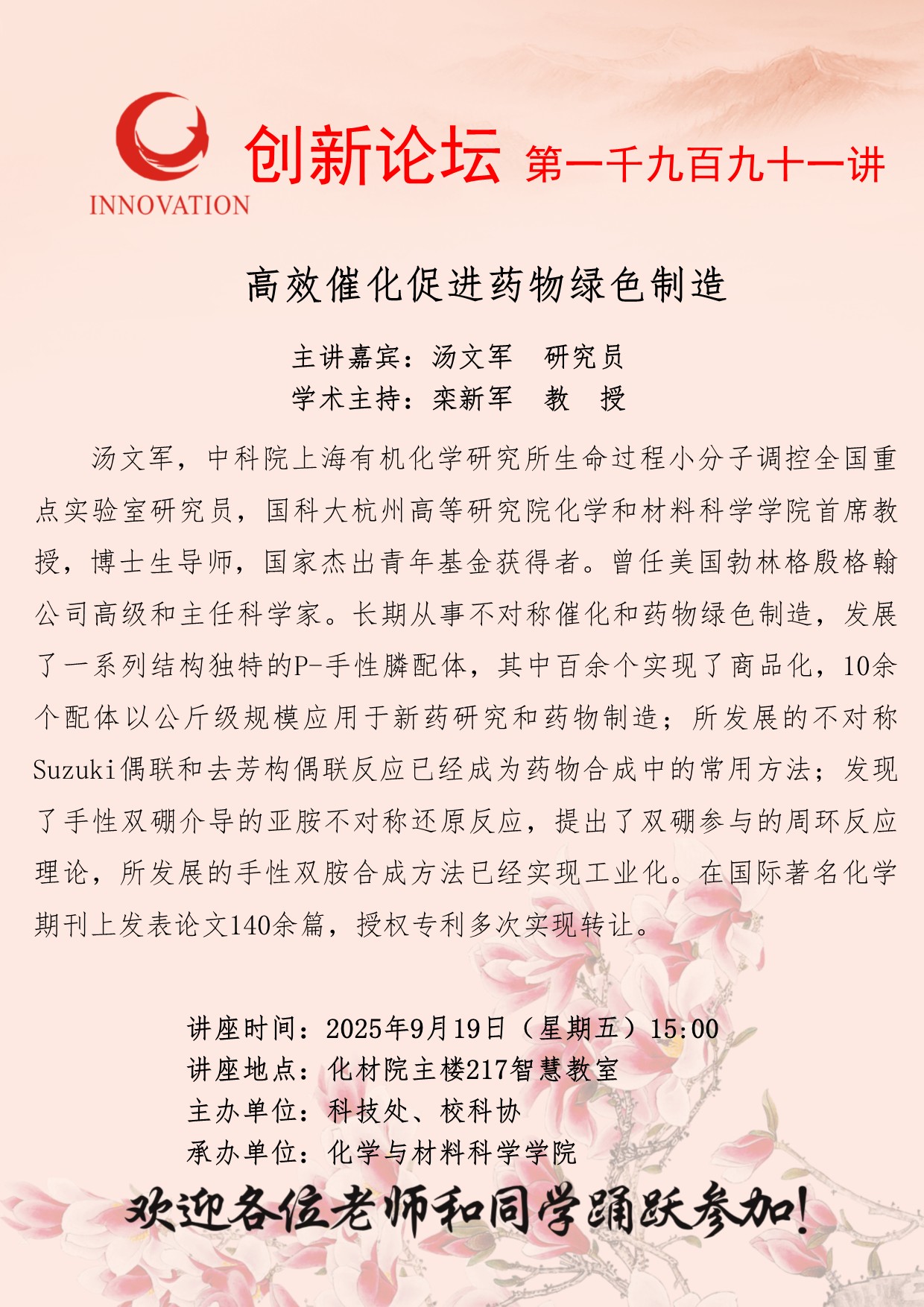 汤文军 研究员 天空(中国)创新论坛第一千九百九十一讲:高效催化促进药物绿色制造 讲座时间 2025年9月19日(星期五)15:00 讲座地点 化材院主楼217智慧教室 讲座人介绍 汤文军 研究员 讲座内容