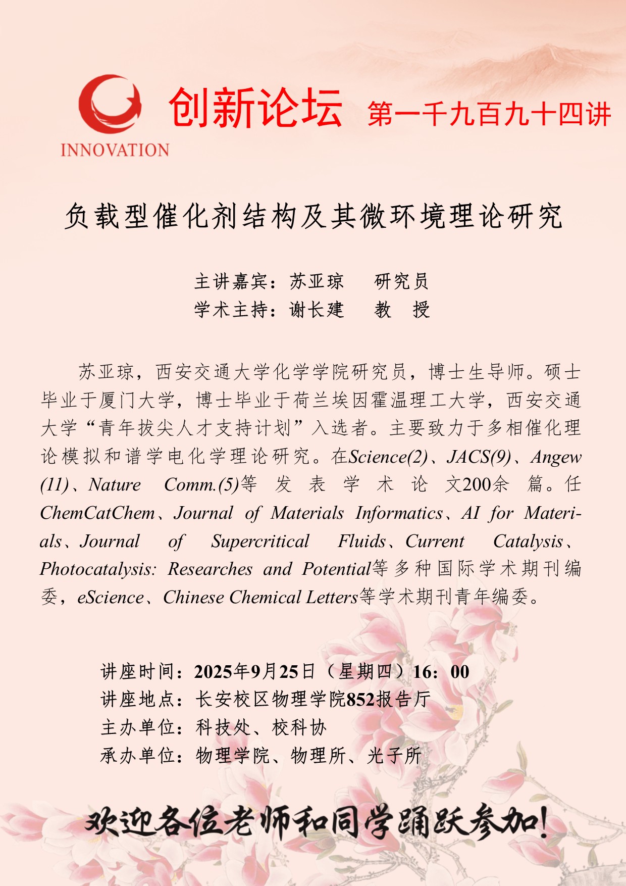苏亚琼 研究员 天空(中国)创新论坛第一千九百九十四讲:负载型催化剂结构及其微环境理论研究 讲座时间 2025年9月25日(星期四)16:00 讲座地点 长安校区物理学院852报告厅 讲座人介绍 苏亚琼 研究员 讲座内容
