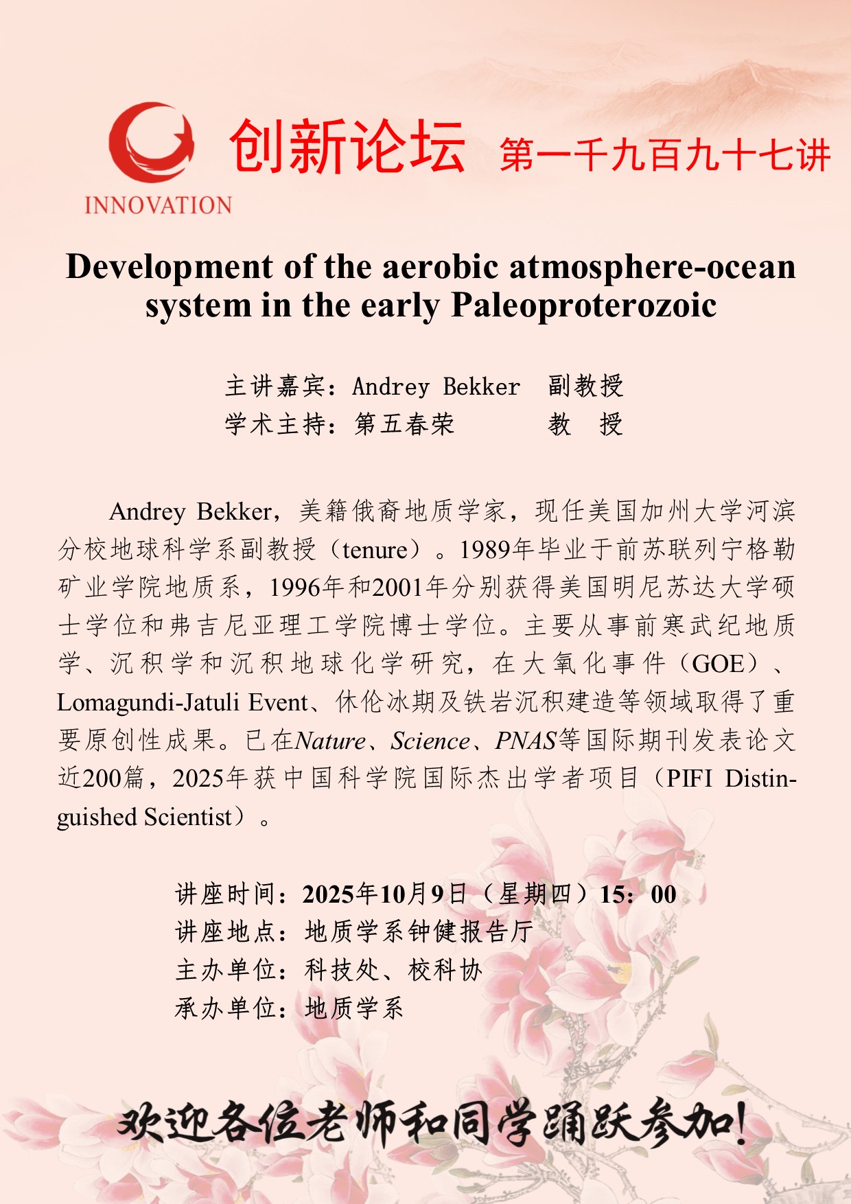 Andrey Bekker 副教授 天空(中国)创新论坛第一千九百九十七讲:Development of the aerobic atmosphere-ocean system in the early Paleoproterozoic 讲座时间 2025年10月9日(星期四)15:00 讲座地点 地质学系钟健报告厅 讲座人介绍 Andrey Bekker 副教授 讲座内容