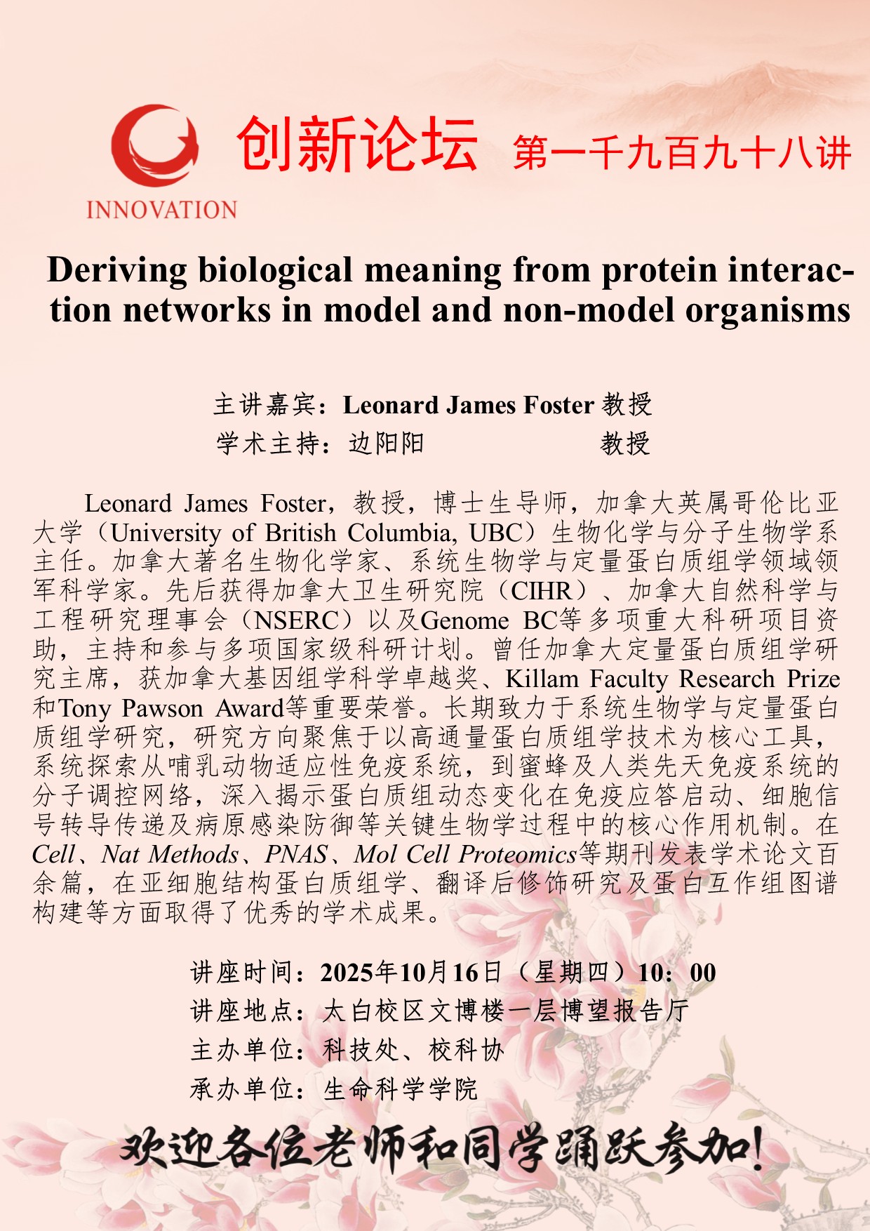 Leonard James Foster 教授 天空(中国)创新论坛第一千九百九十八讲:Deriving biological meaning from protein interaction networks in model and non-model organisms 讲座时间 2025年10月16日(星期四)10:00 讲座地点 太白校区文博楼一层博望报告厅 讲座人介绍 Leonard James Foster 教授 讲座内容