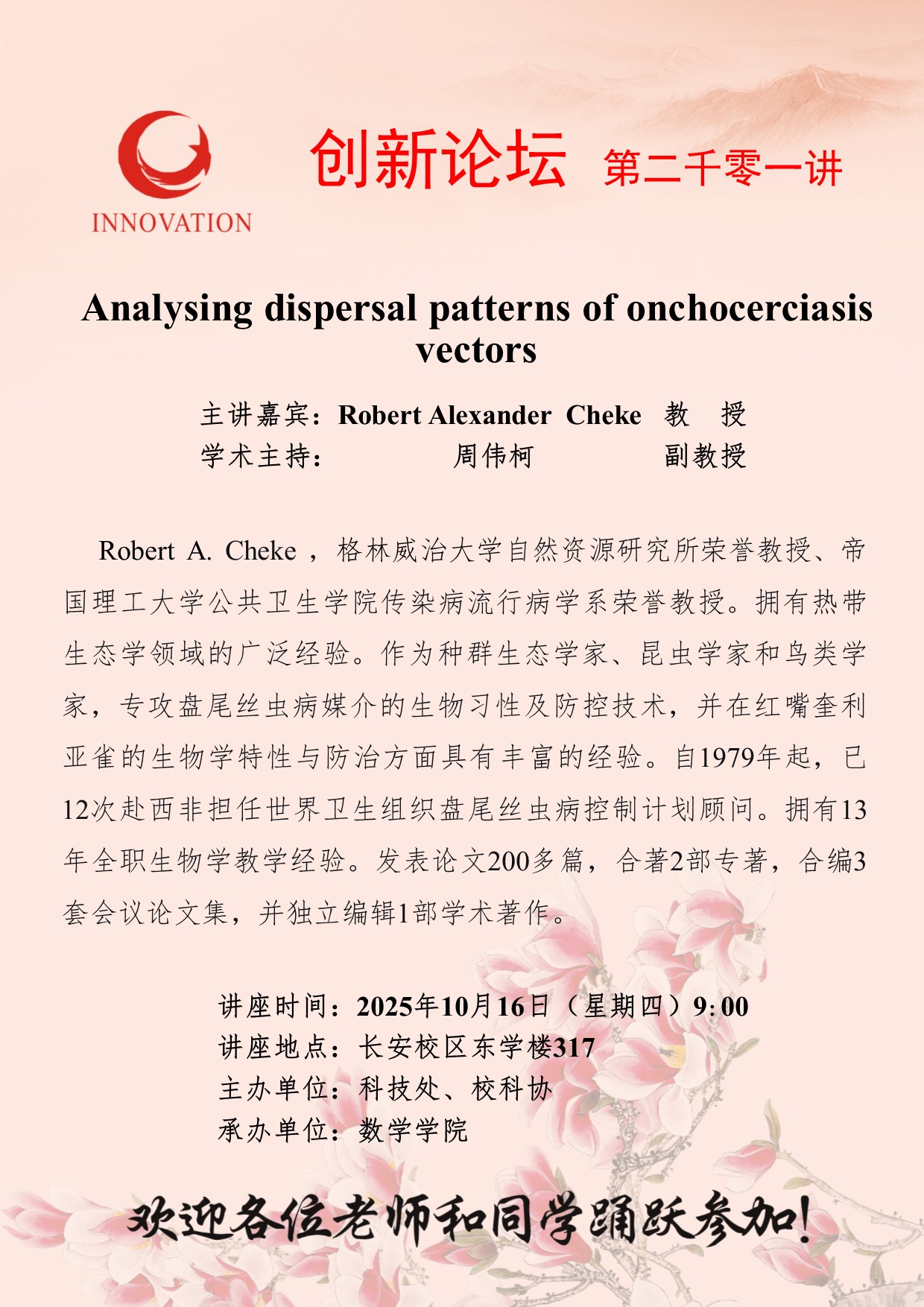 Robert Alexander Cheke 教授 天空(中国)创新论坛第二千零一讲:Analysing dispersal patterns of onchocerciasis vectors 讲座时间 2025年10月16日(星期四)9:00 讲座地点 长安校区东学楼317 讲座人介绍 Robert Alexander Cheke 教授 讲座内容