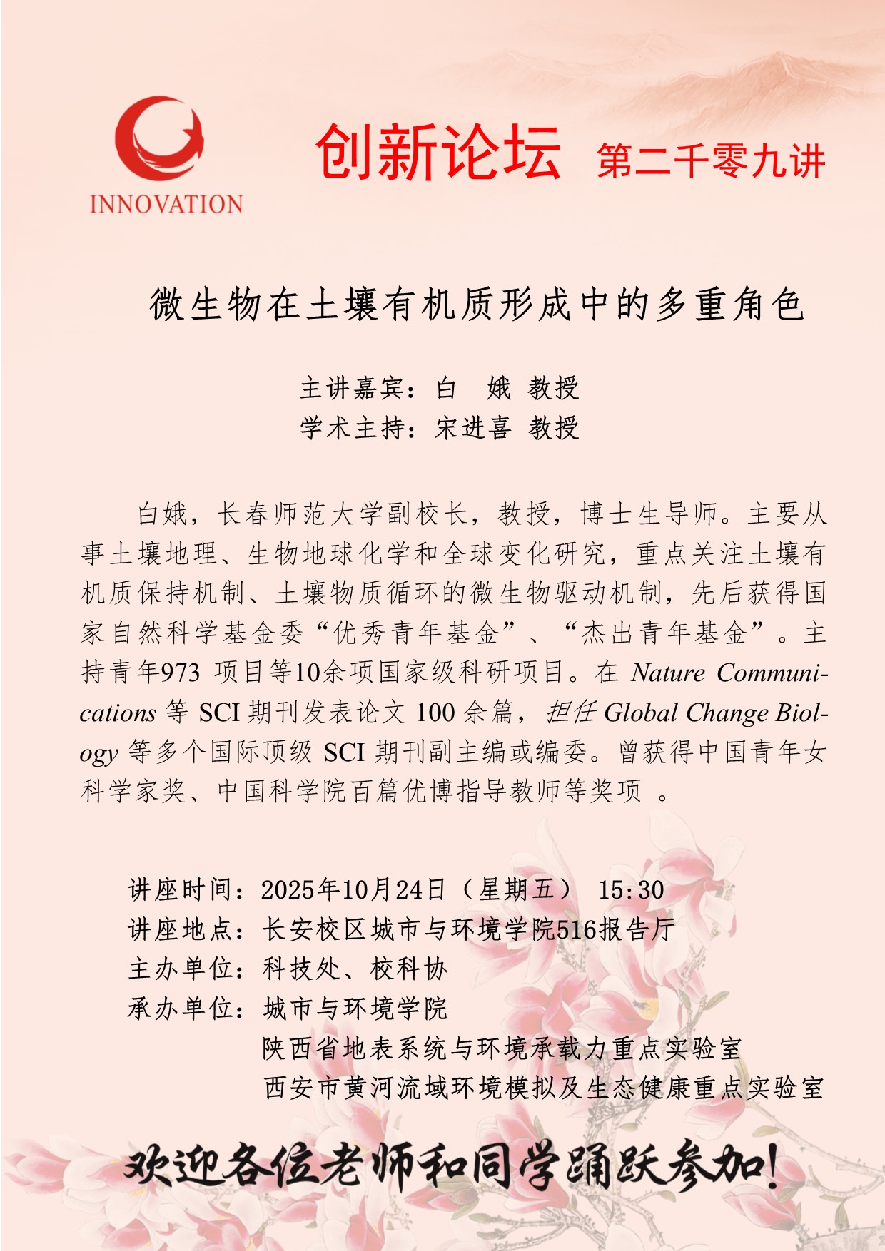 白娥 教授 天空(中国)创新论坛第二千零九讲:微生物在土壤有机质形成中的多重角色 讲座时间 2025年10月24日(星期五) 15:30 讲座地点 长安校区城市与环境学院516报告厅 讲座人介绍 白娥 教授 讲座内容