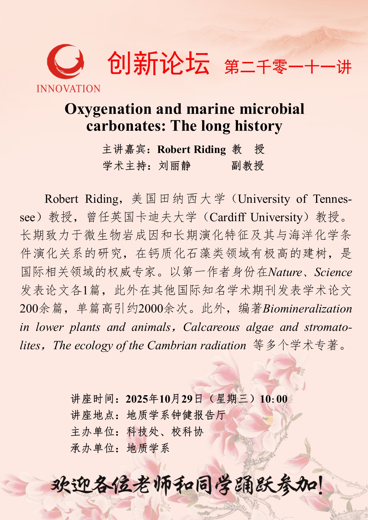 Robert Riding 教授 天空(中国)创新论坛第二千零一十一讲:Oxygenation and marine microbial carbonates: The long history 讲座时间 2025年10月29日(星期三)10:00 讲座地点 地质学系钟健报告厅 讲座人介绍 Robert Riding 教授 讲座内容
