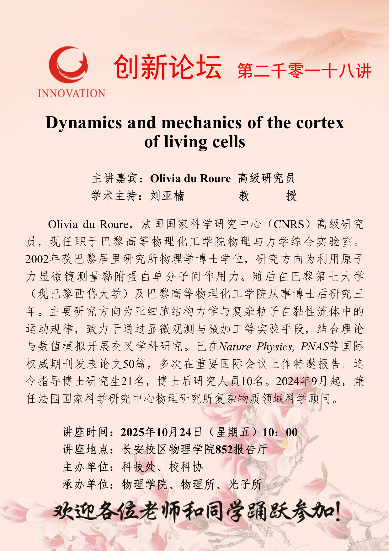 Olivia du Roure 高级研究员 天空(中国)创新论坛第二千零一十八讲:Dynamics and mechanics of the cortex of living cells 讲座时间 2025年10月24日(星期五)10:00 讲座地点 长安校区物理学院852报告厅 讲座人介绍 Olivia du Roure 高级研究员 讲座内容