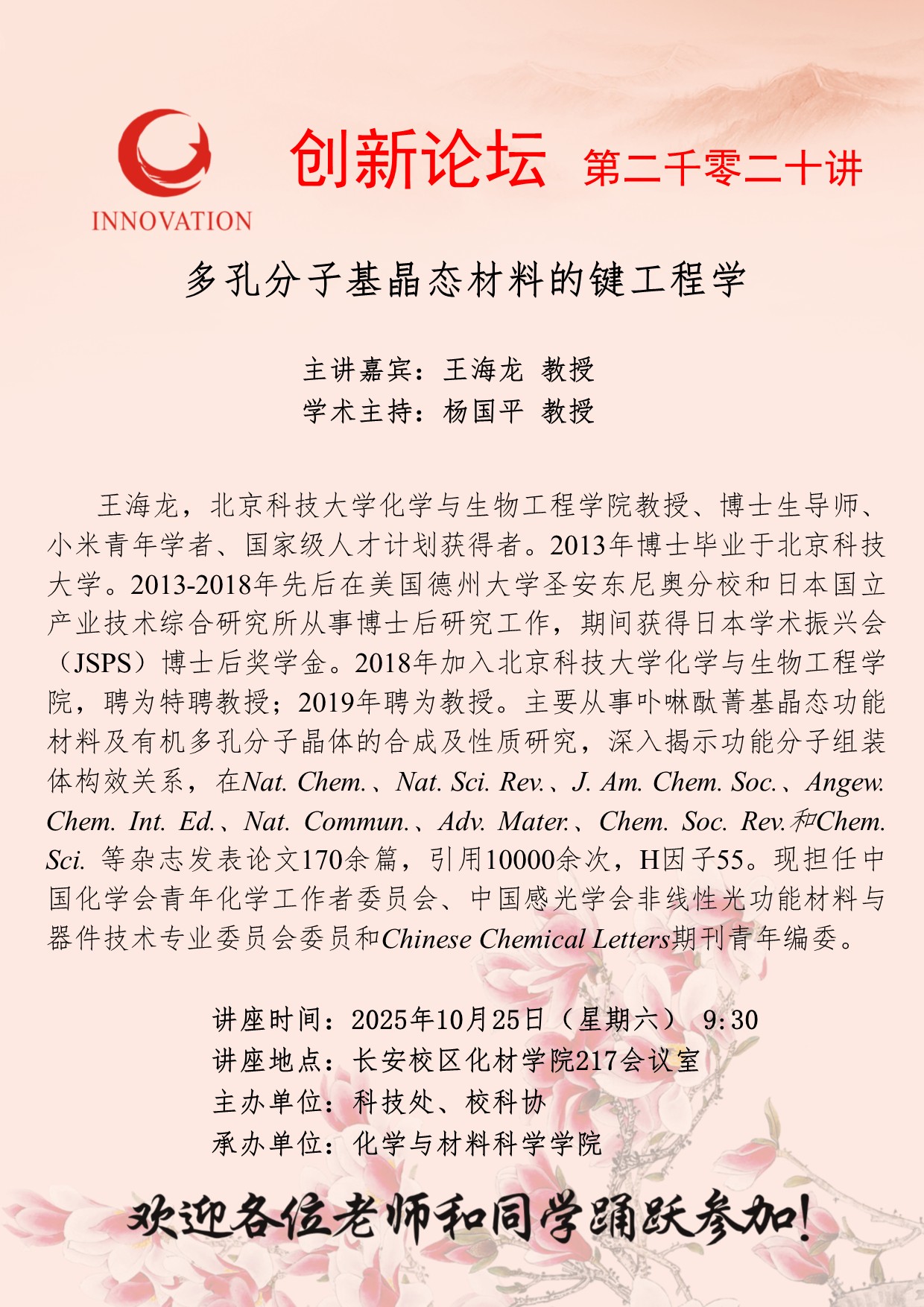 王海龙 教授 天空(中国)创新论坛第二千零二十讲:多孔分子基晶态材料的键工程学 讲座时间 2025年10月25日(星期六) 9:30 讲座地点 长安校区化材学院217会议室 讲座人介绍 王海龙 教授 讲座内容