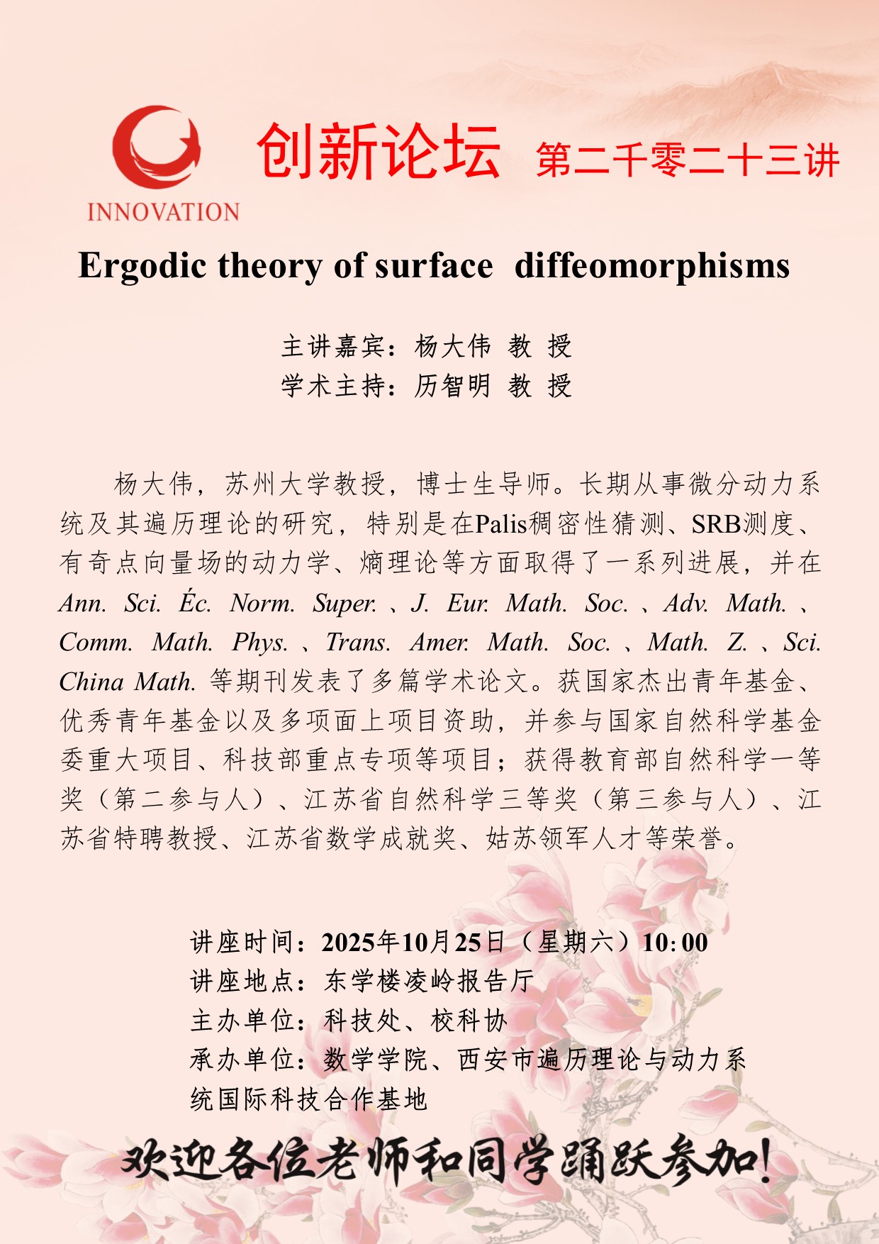 杨大伟 教 授 天空(中国)创新论坛第二千零二十三讲:Ergodic theory of surface diffeomorphisms 讲座时间 2025年10月25日(星期六)10:00 讲座地点 东学楼凌岭报告厅 讲座人介绍 杨大伟 教 授 讲座内容