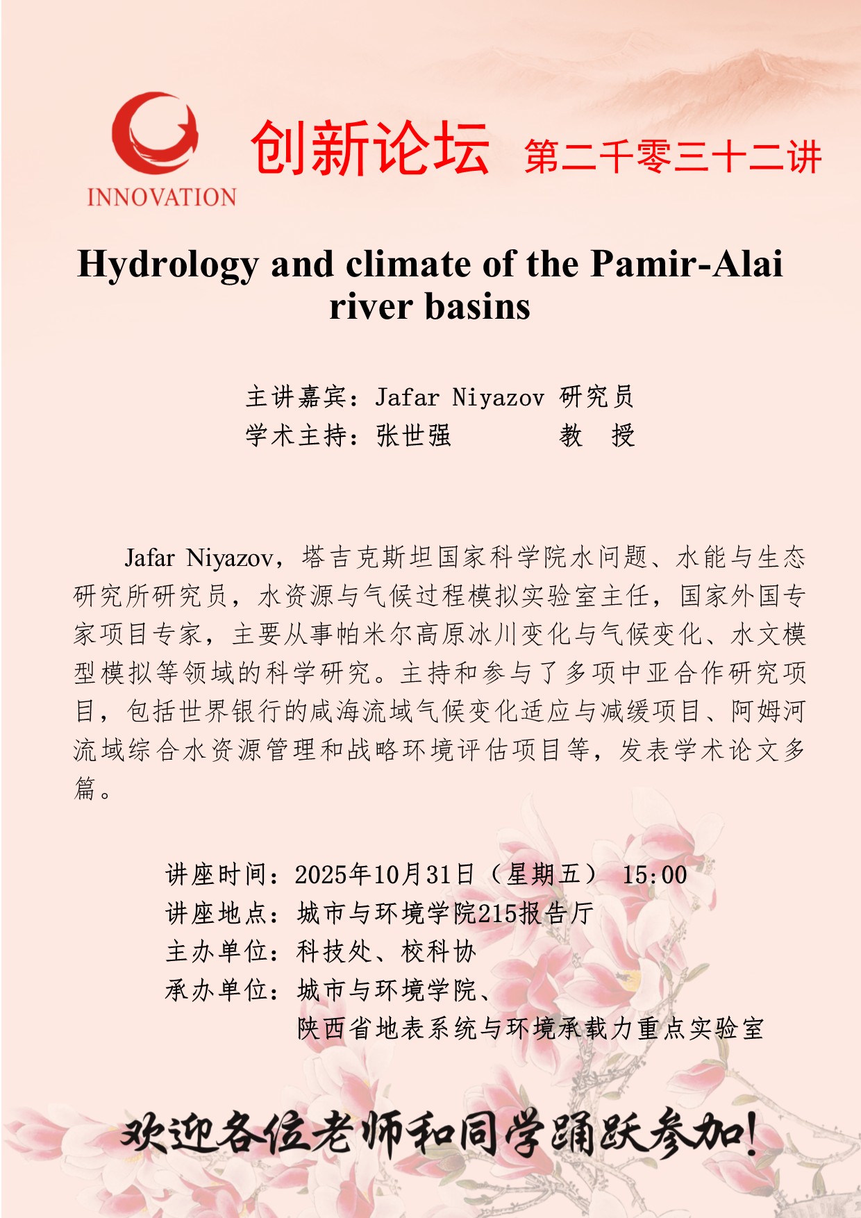 Jafar Niyazov 研究员 天空(中国)创新论坛第二千零三十二讲:Hydrology and climate of the Pamir-Alai river basins 讲座时间 2025年10月31日(星期五) 15:00 讲座地点 城市与环境学院215报告厅 讲座人介绍 Jafar Niyazov 研究员 讲座内容