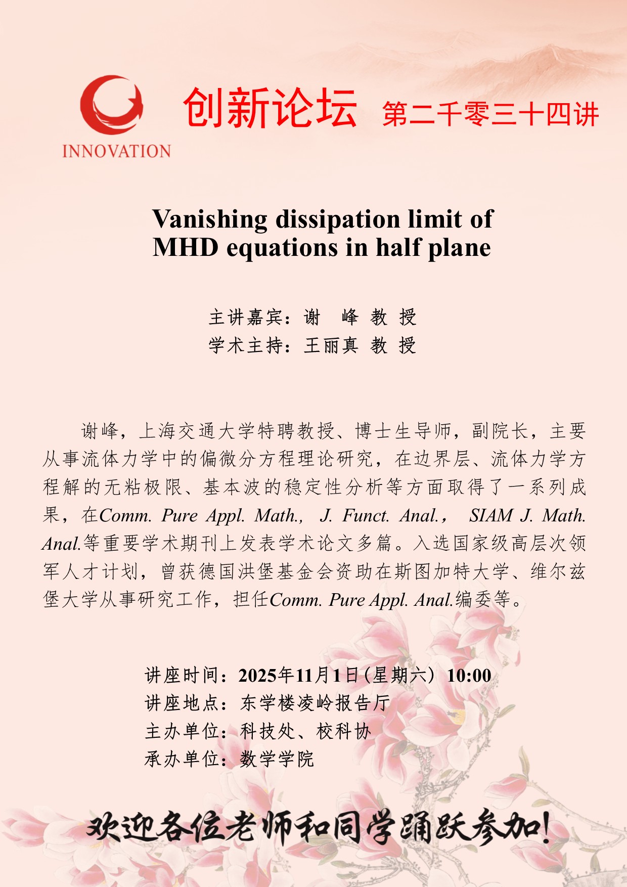 谢 峰 教 授 天空(中国)创新论坛第二千零三十四讲:Vanishing dissipation limit of MHD equations in half plane 讲座时间 2025年11月1日(星期六) 10:00 讲座地点 东学楼凌岭报告厅 讲座人介绍 谢 峰 教 授 讲座内容