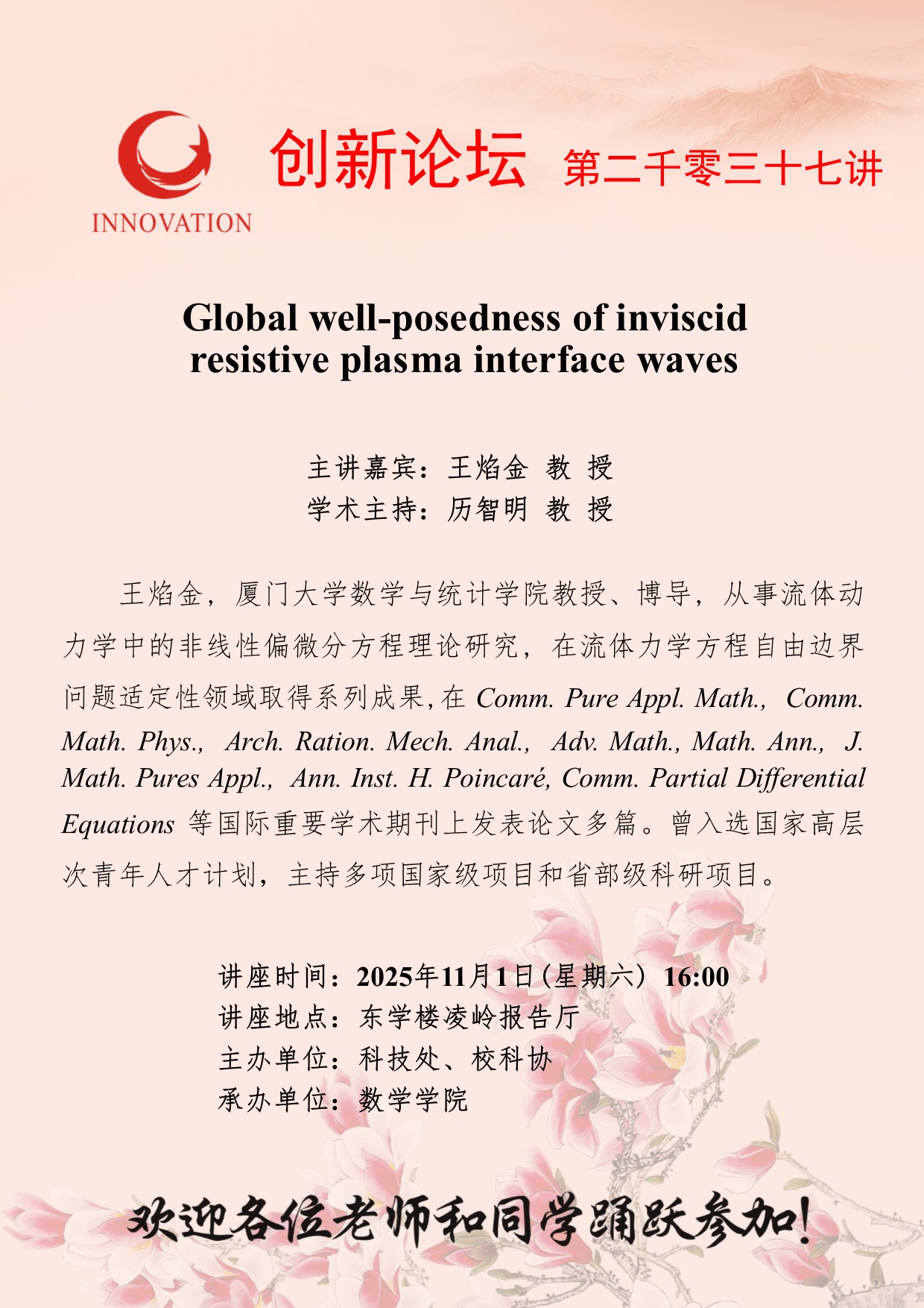 王焰金 教 授 天空(中国)创新论坛第二千零三十七讲:Global well-posedness of inviscid resistive plasma interface waves 讲座时间 2025年11月1日(星期六) 16:00 讲座地点 东学楼凌岭报告厅 讲座人介绍 王焰金 教 授 讲座内容