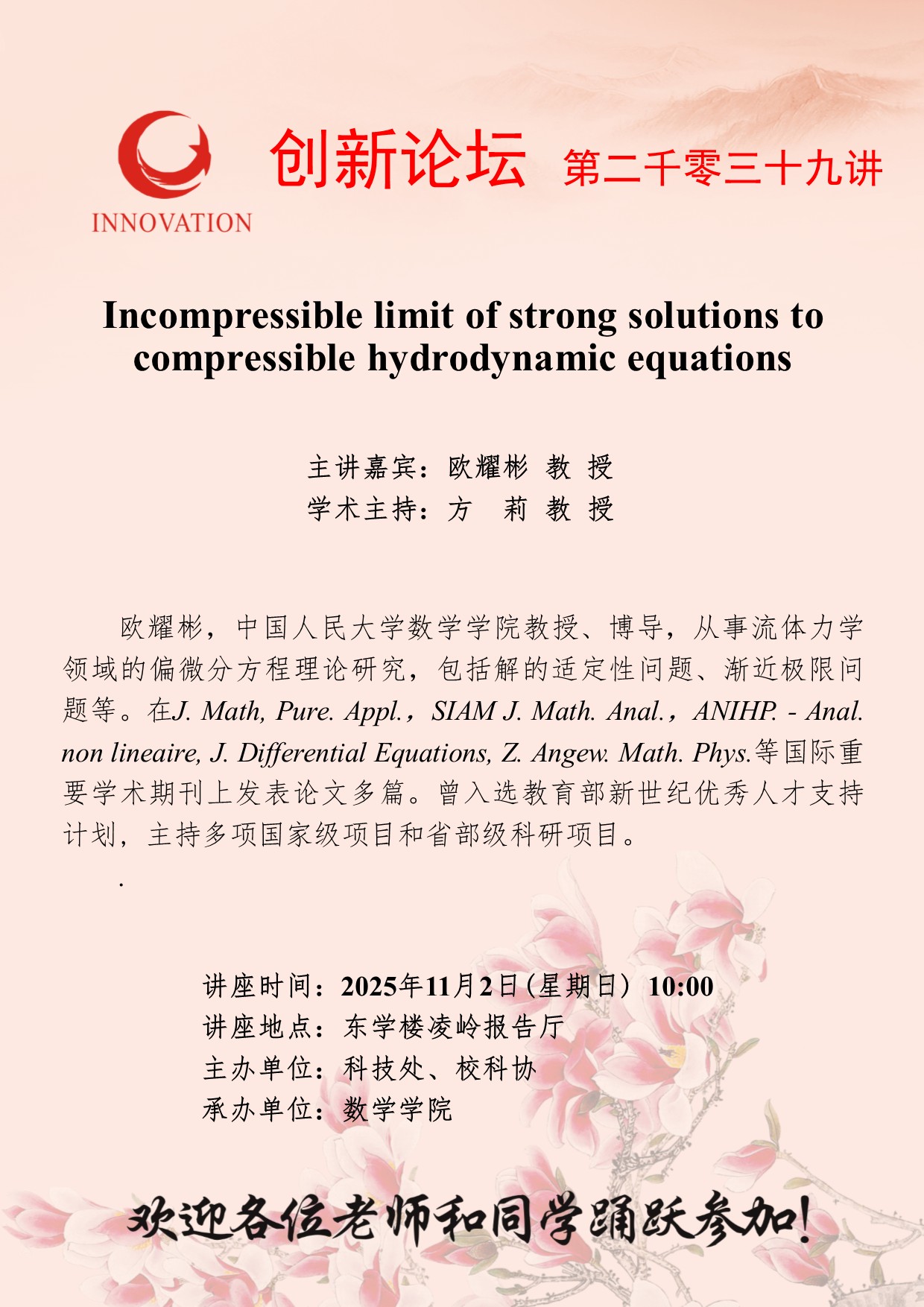 欧耀彬 教 授 天空(中国)创新论坛第二千零三十九讲:Incompressible limit of strong solutions to compressible hydrodynamic equations 讲座时间 2025年11月2日(星期日) 10:00 讲座地点 东学楼凌岭报告厅 讲座人介绍 欧耀彬 教 授 讲座内容