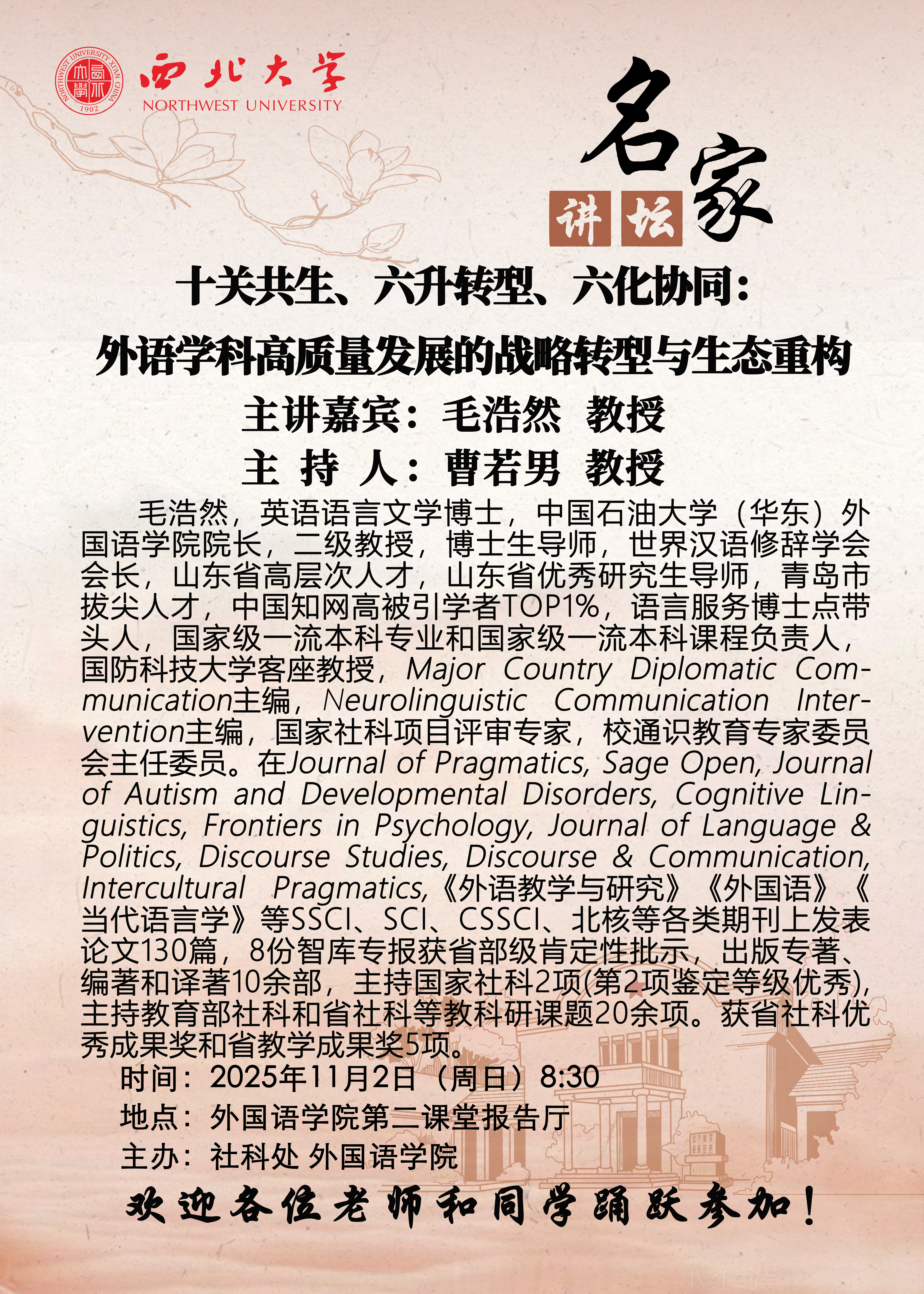 毛浩然 教授 名家讲坛:十关共生、六升转型、六化协同:外语学科高质量发展的战略转型与生态重构 讲座时间 2025年11月2日(周日)8:30 讲座地点 外国语学院第二课堂报告厅 讲座人介绍 毛浩然 教授 讲座内容