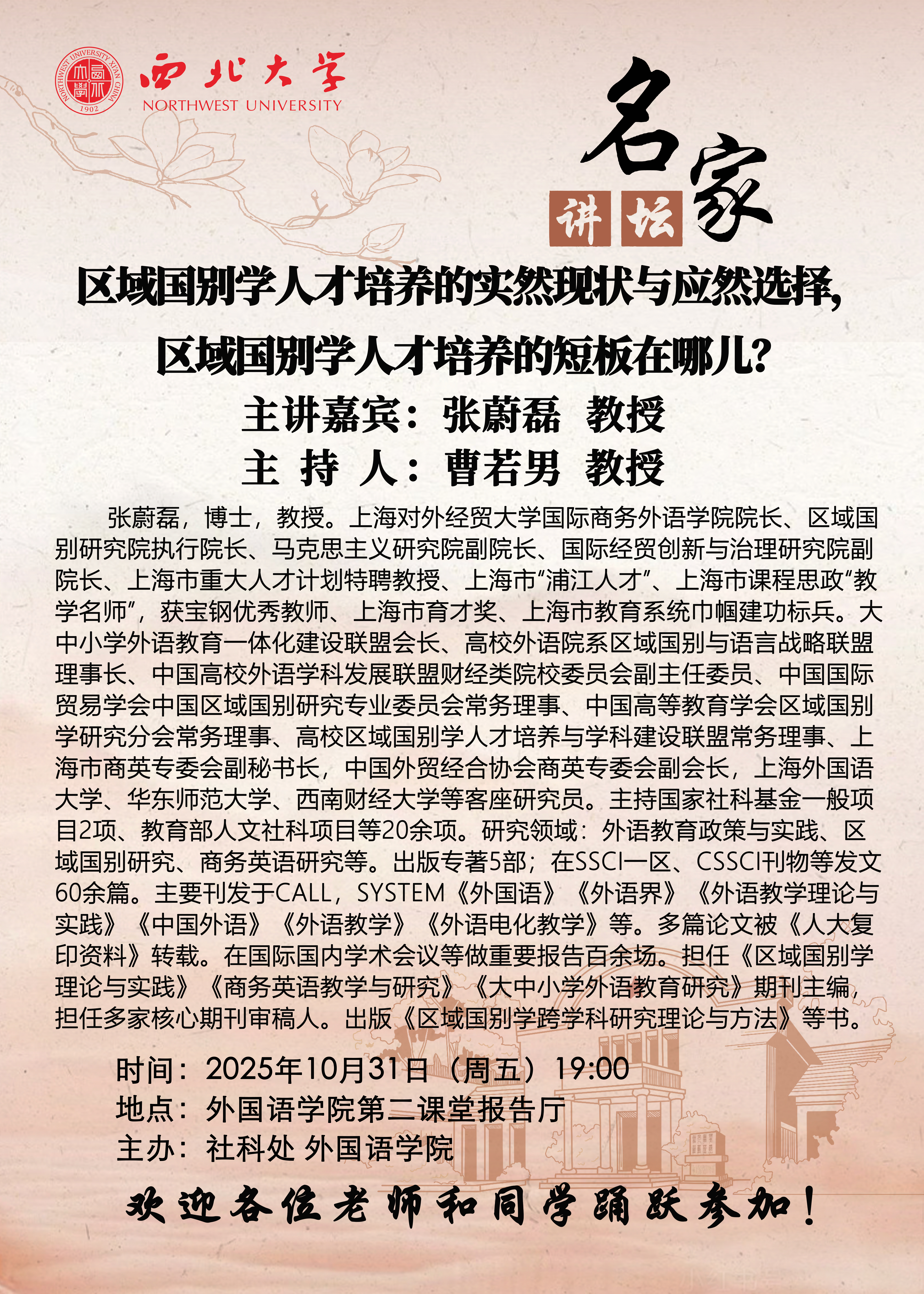 张蔚磊 教授 名家讲坛:区域国别学人才培养的实然现状与应然选择,区域国别学人才培养的短板在哪儿? 讲座时间 2025年10月31日(周五)19:00 讲座地点 外国语学院第二课堂报告厅 讲座人介绍 张蔚磊 教授 讲座内容