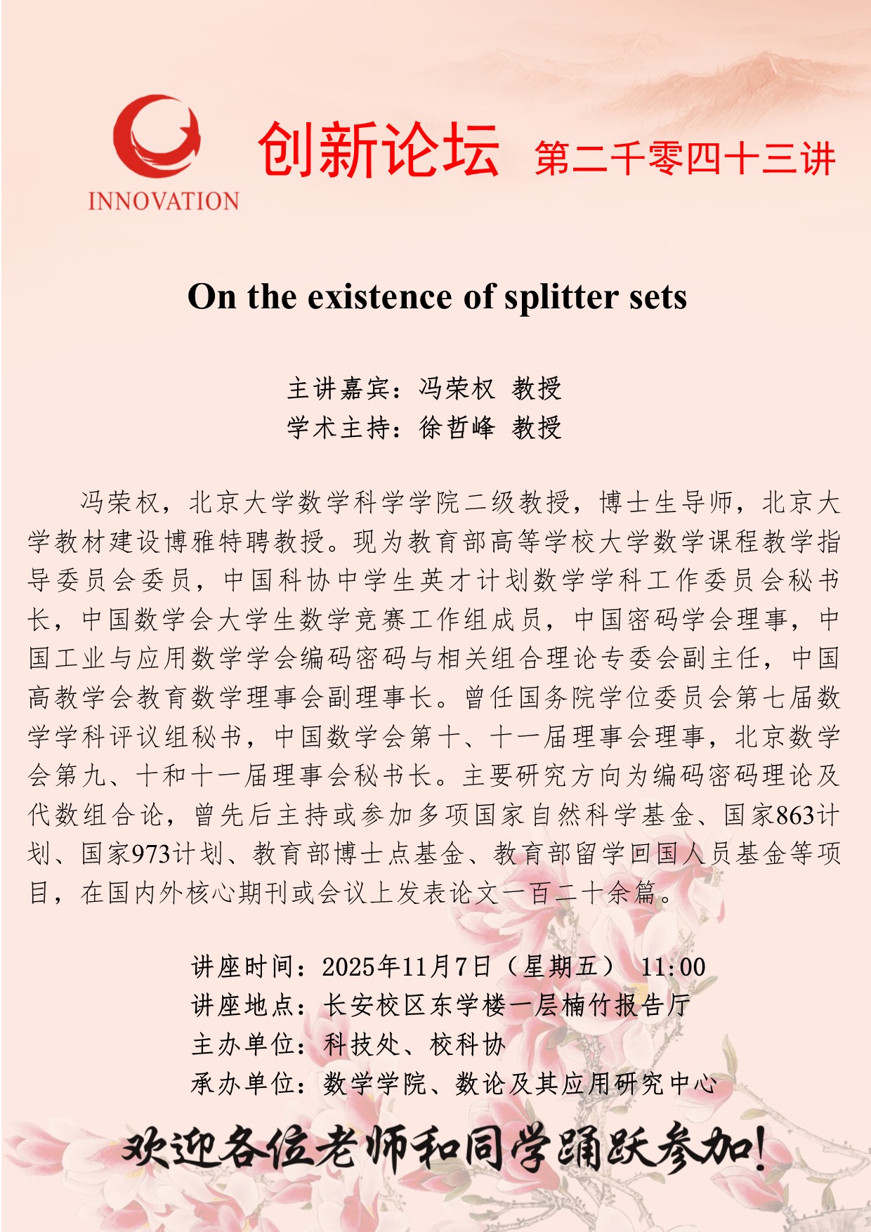 冯荣权 教授 天空(中国)创新论坛第二千零四十三讲:On the existence of splitter sets 讲座时间 2025年11月7日(星期五) 11:00 讲座地点 长安校区东学楼一层楠竹报告厅 讲座人介绍 冯荣权 教授 讲座内容
