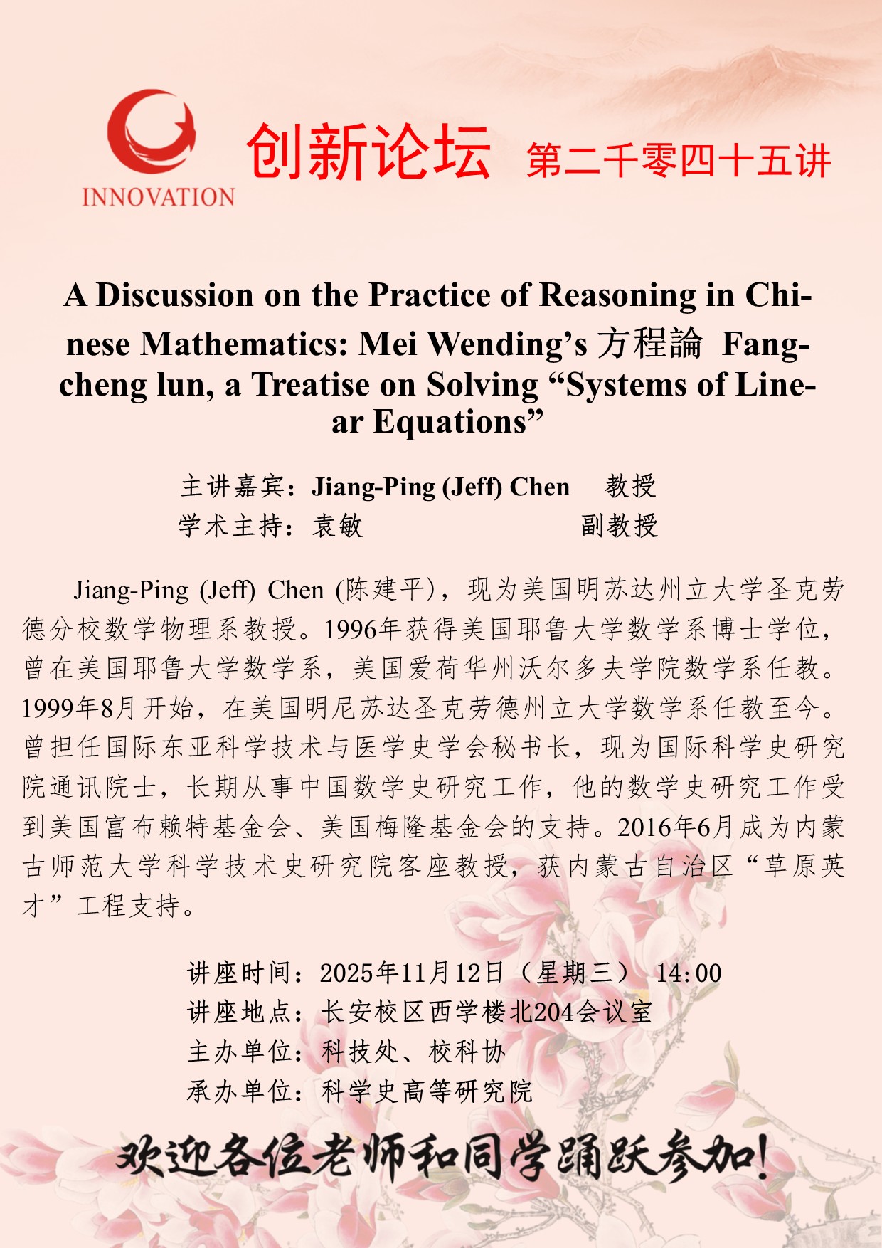 Jiang-Ping (Jeff) Chen 教授 天空(中国)创新论坛第二千零四十五讲:A Discussion on the Practice of Reasoning in Chinese Mathematics: Mei Wending’s 方程論 Fangcheng lun, a Treatise on Solving “Systems of Linear Equations” 讲座时间 2025年11月12日(星期三) 14:00 讲座地点 长安校区西学楼北204会议室 讲座人介绍 Jiang-Ping (Jeff) Chen 教授 讲座内容