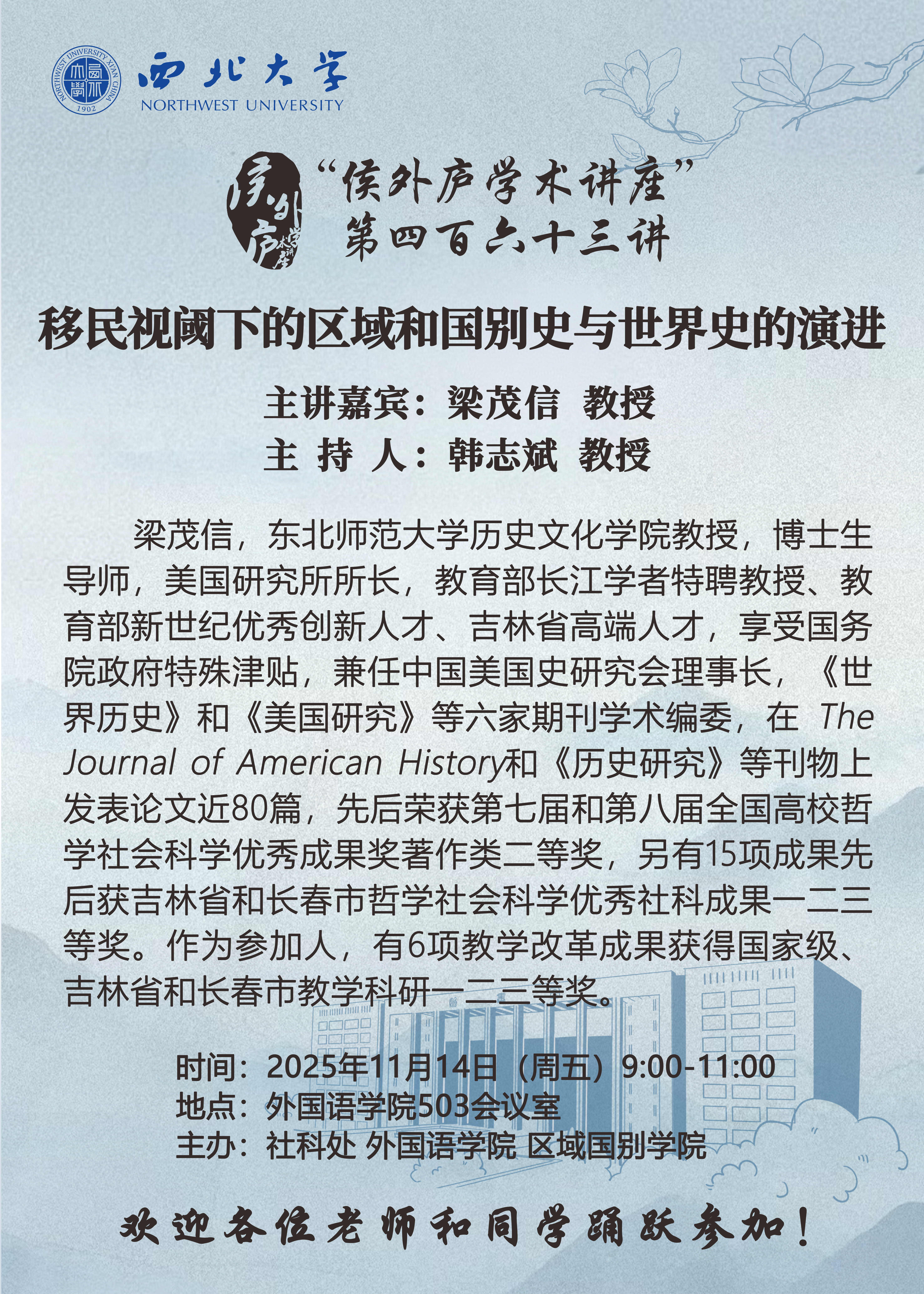 梁茂信 教授 “侯外庐学术讲座”第四百六十三讲:移民视阈下的区域和国别史与世界史的演进 讲座时间 2025年11月14日(周五)9:00-11:00 讲座地点 外国语学院503会议室 讲座人介绍 梁茂信 教授 讲座内容