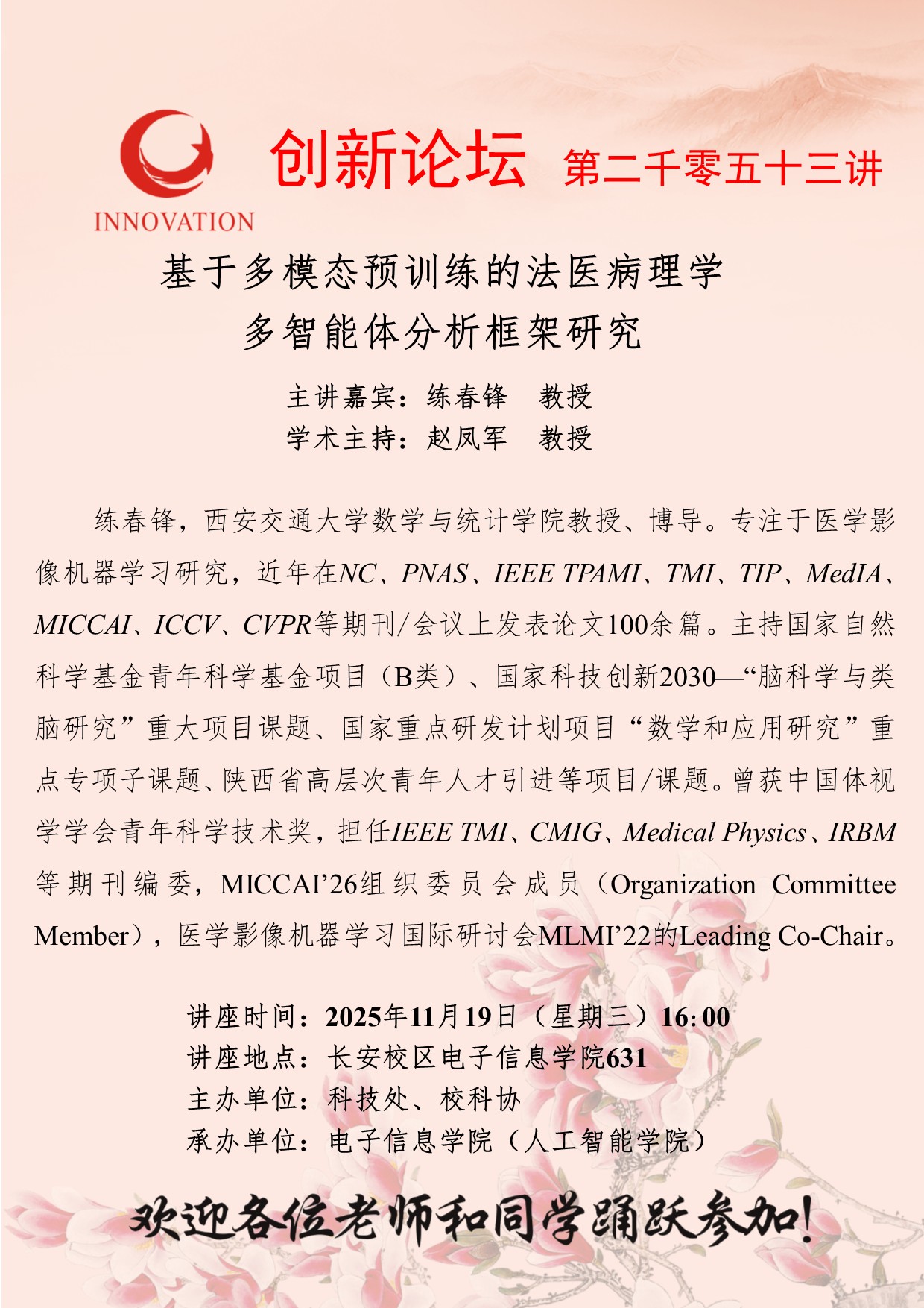 练春锋 教授 天空(中国)创新论坛第二千零五十三讲:基于多模态预训练的法医病理学多智能体分析框架研究 讲座时间 2025年11月19日(星期三)16:00 讲座地点 长安校区电子信息学院631 讲座人介绍 练春锋 教授 讲座内容