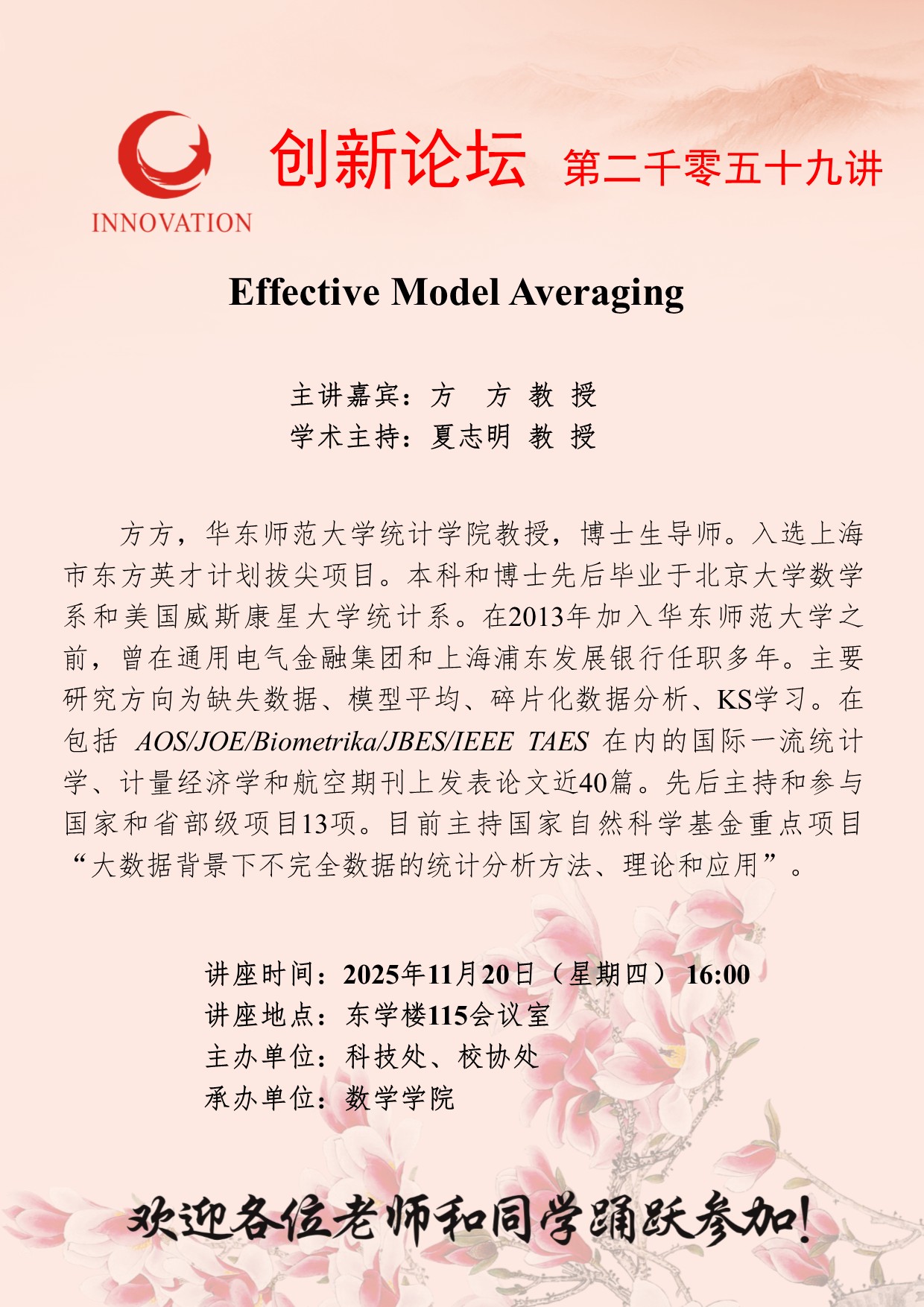 方方 教授 天空(中国)创新论坛第二千零五十九讲:Effective Model Averaging 讲座时间 2025年11月20日(星期四) 16:00 讲座地点 东学楼115会议室 讲座人介绍 方方 教授 讲座内容
