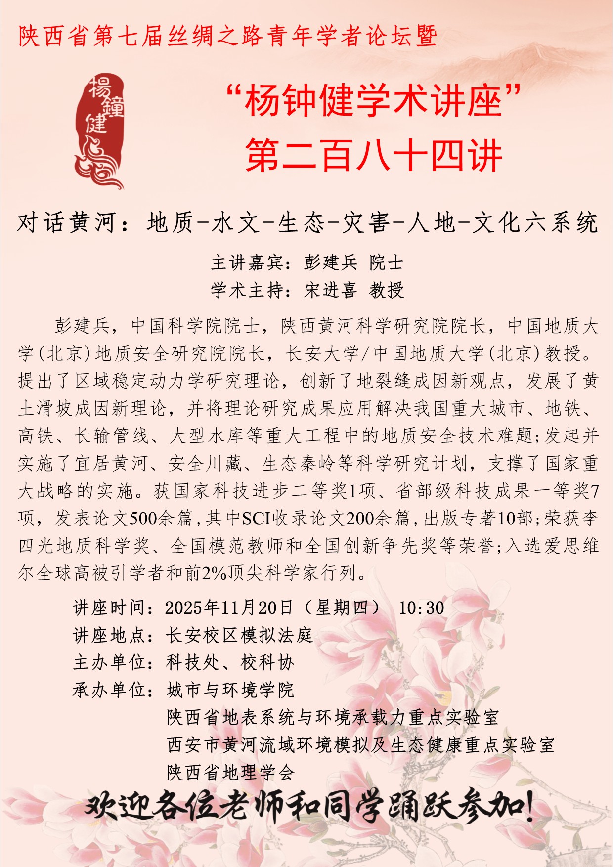 彭建兵 院士 “杨钟健学术讲座”第二百八十四讲:对话黄河:地质-水文-生态-灾害-人地-文化六系统 讲座时间 2025年11月20日(星期四) 10:30 讲座地点 长安校区模拟法庭 讲座人介绍 彭建兵 院士 讲座内容