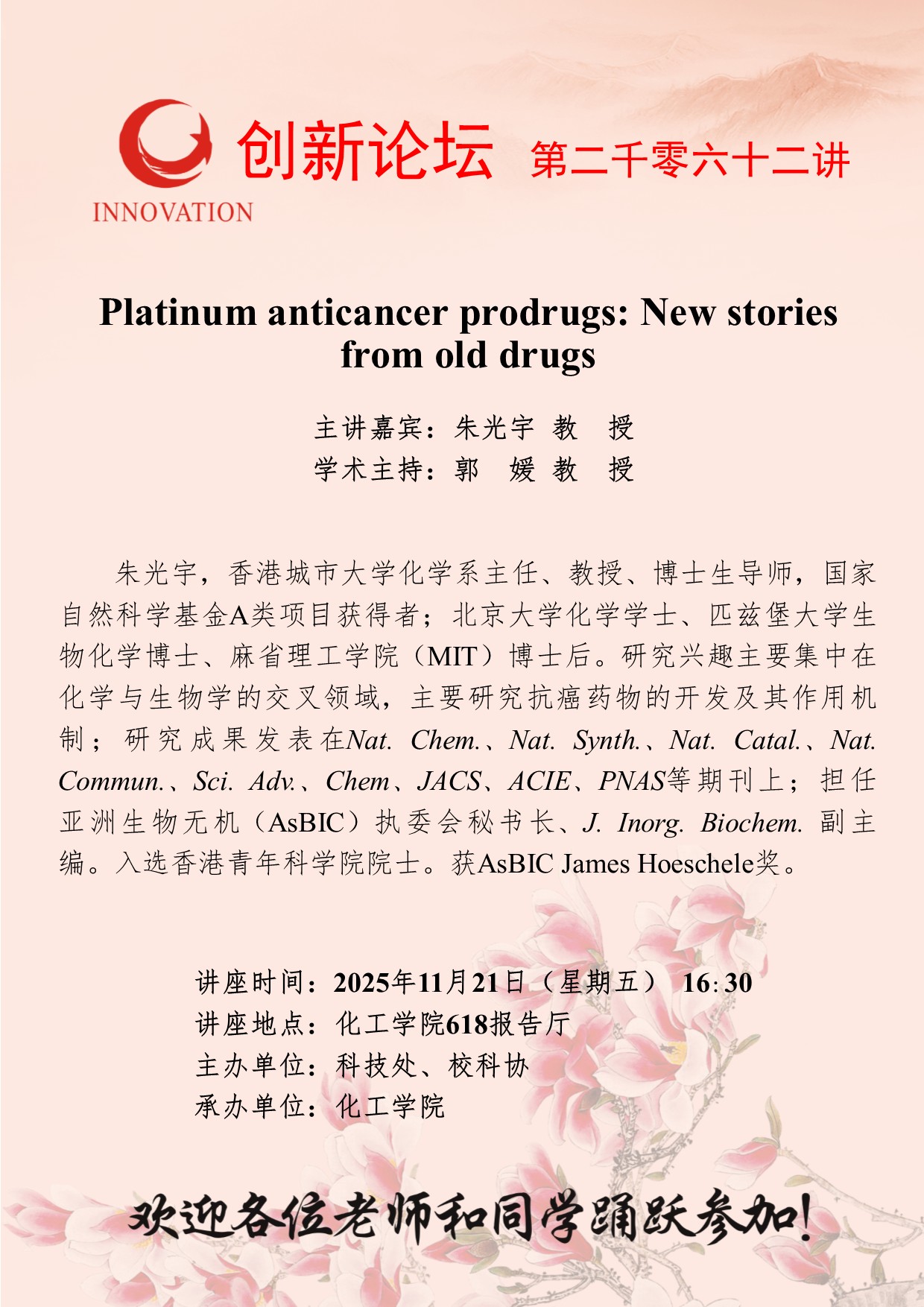 朱光宇 教授 天空(中国)创新论坛第二千零六十二讲:Platinum anticancer prodrugs: New stories from old drugs 讲座时间 2025年11月21日(星期五) 16:30 讲座地点 化工学院618报告厅 讲座人介绍 朱光宇 教授 讲座内容