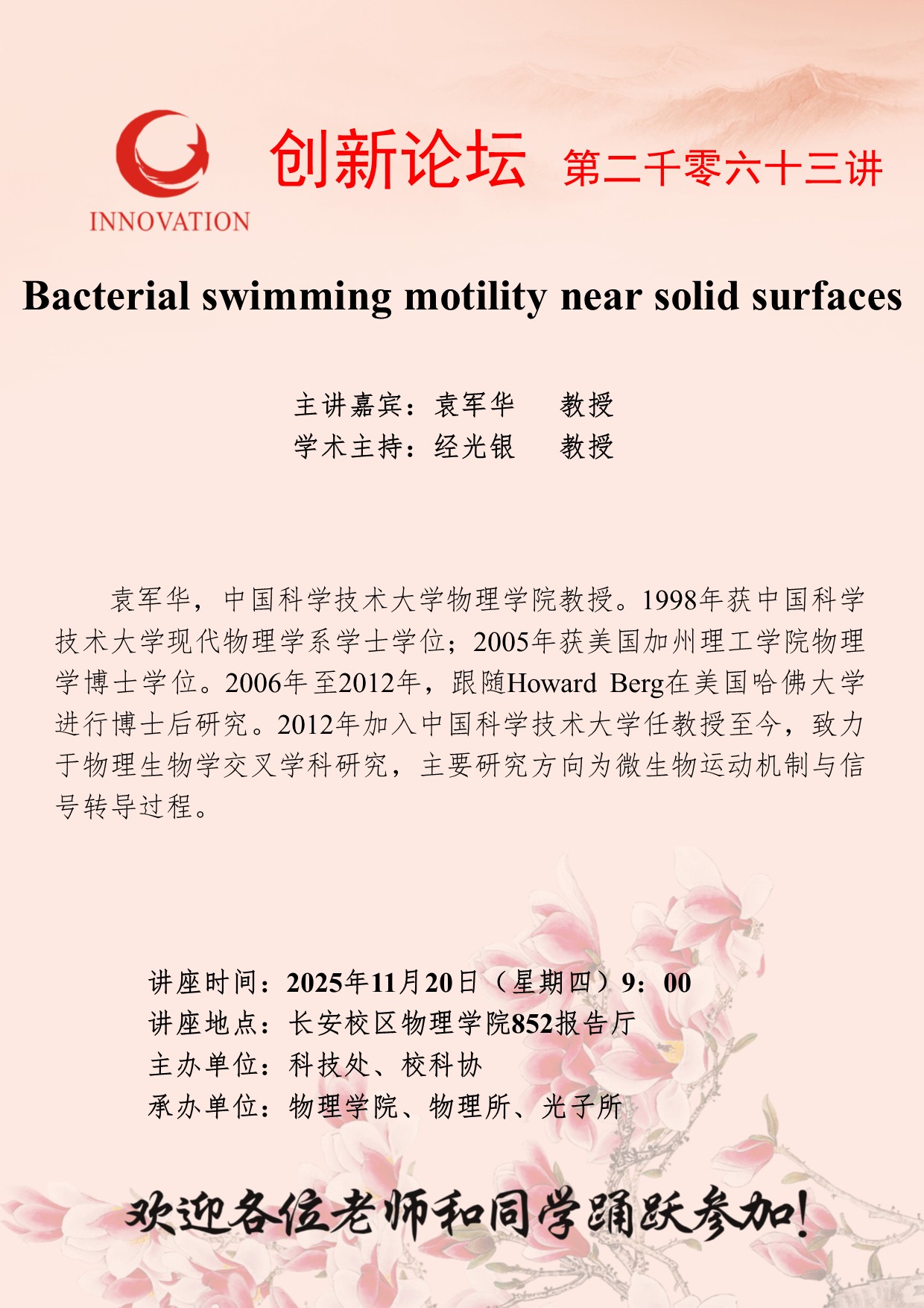 袁军华 教授 天空(中国)创新论坛第二千零六十三讲:Bacterial swimming motility near solid surfaces 讲座时间 2025年11月20日(星期四)9:00 讲座地点 长安校区物理学院852报告厅 讲座人介绍 袁军华 教授 讲座内容