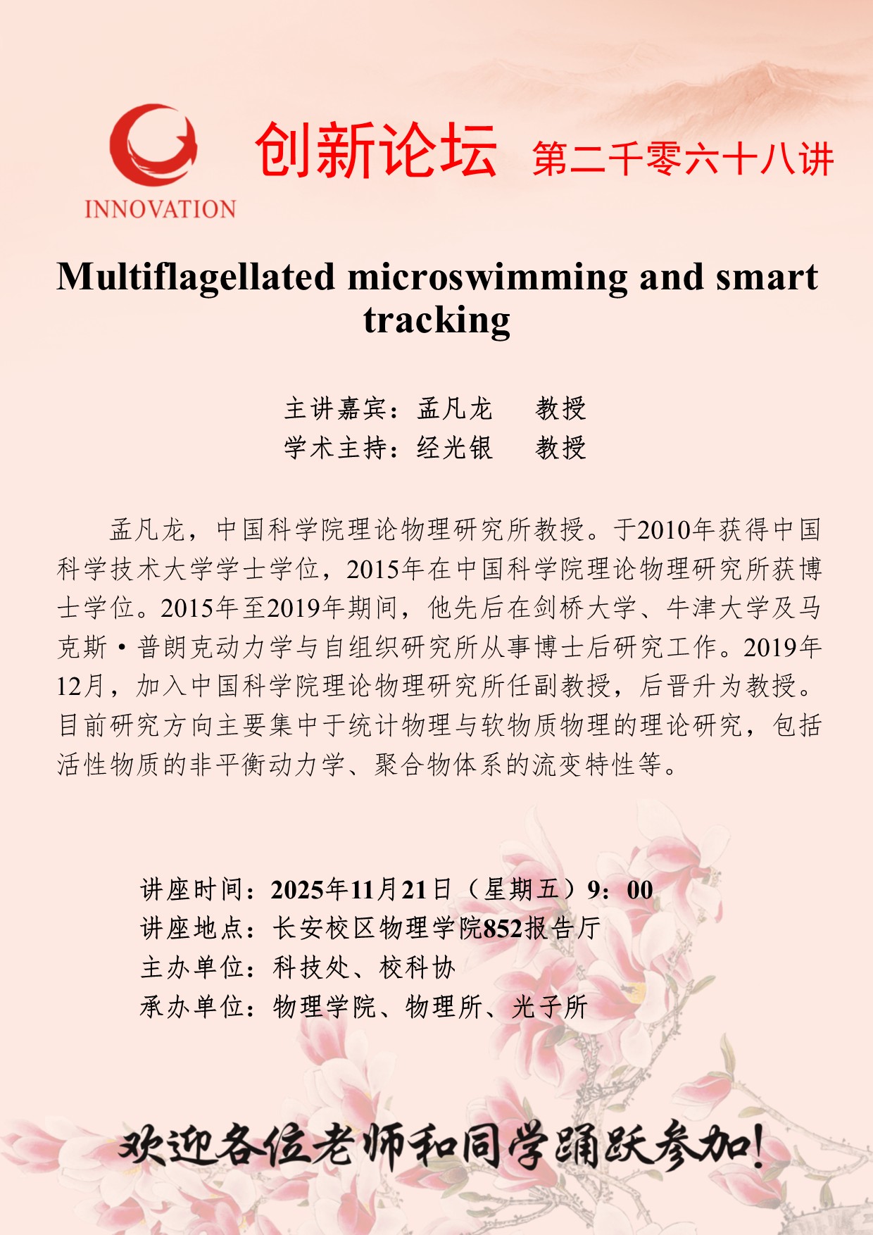 孟凡龙 教授 天空(中国)创新论坛第二千零六十八讲:Multiflagellated microswimming and smart tracking 讲座时间 2025年11月21日(星期五)9:00 讲座地点 长安校区物理学院852报告厅 讲座人介绍 孟凡龙 教授 讲座内容