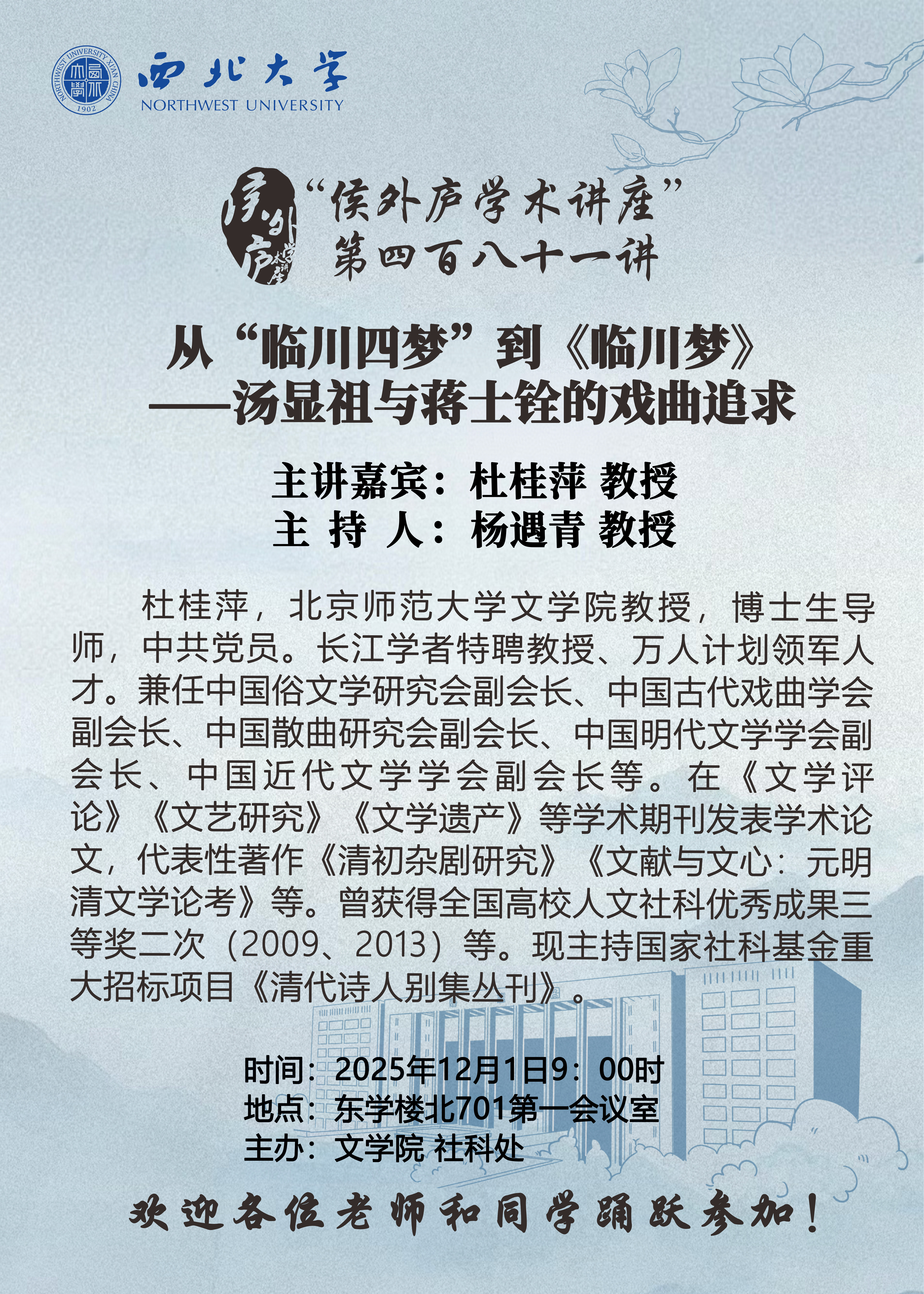 “侯外庐学术讲座”第四百八十一讲:从“临川四梦”到《临川梦》——汤显祖与蒋士铨的戏曲追求