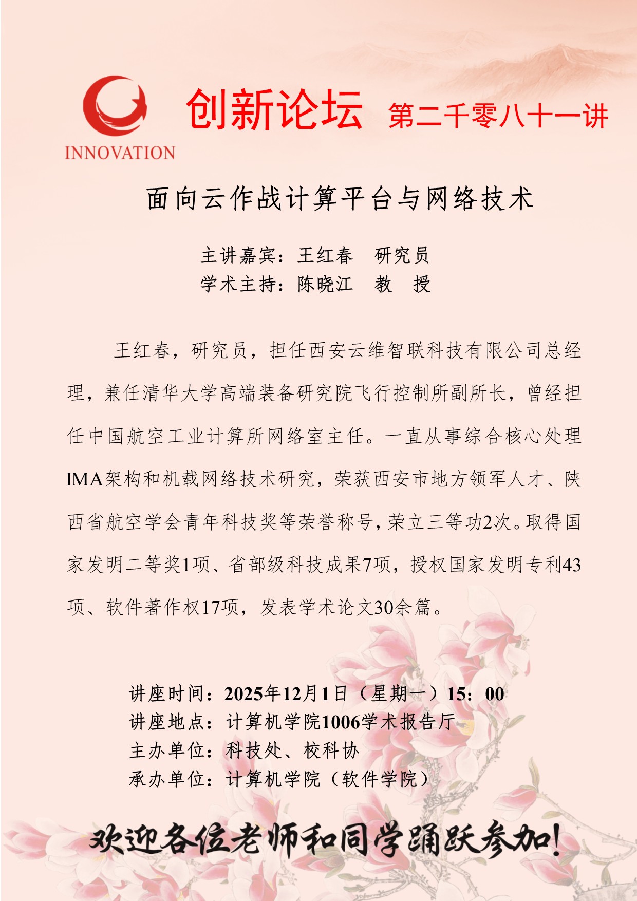 王红春 研究员 天空(中国)创新论坛第二千零八十一讲:面向云作战计算平台与网络技术 讲座时间 2025年12月1日(星期一)15:00 讲座地点 计算机学院1006学术报告厅 讲座人介绍 王红春 研究员 讲座内容