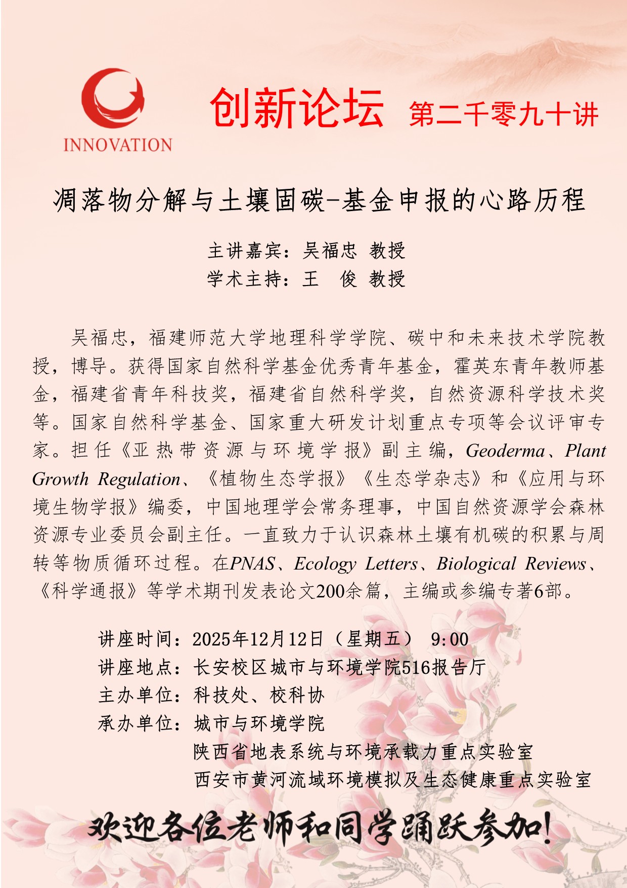 吴福忠 教授 天空(中国)创新论坛第二千零九十讲:凋落物分解与土壤固碳-基金申报的心路历程 讲座时间 2025年12月12日(星期五) 9:00 讲座地点 长安校区城市与环境学院516报告厅 讲座人介绍 吴福忠 教授 讲座内容