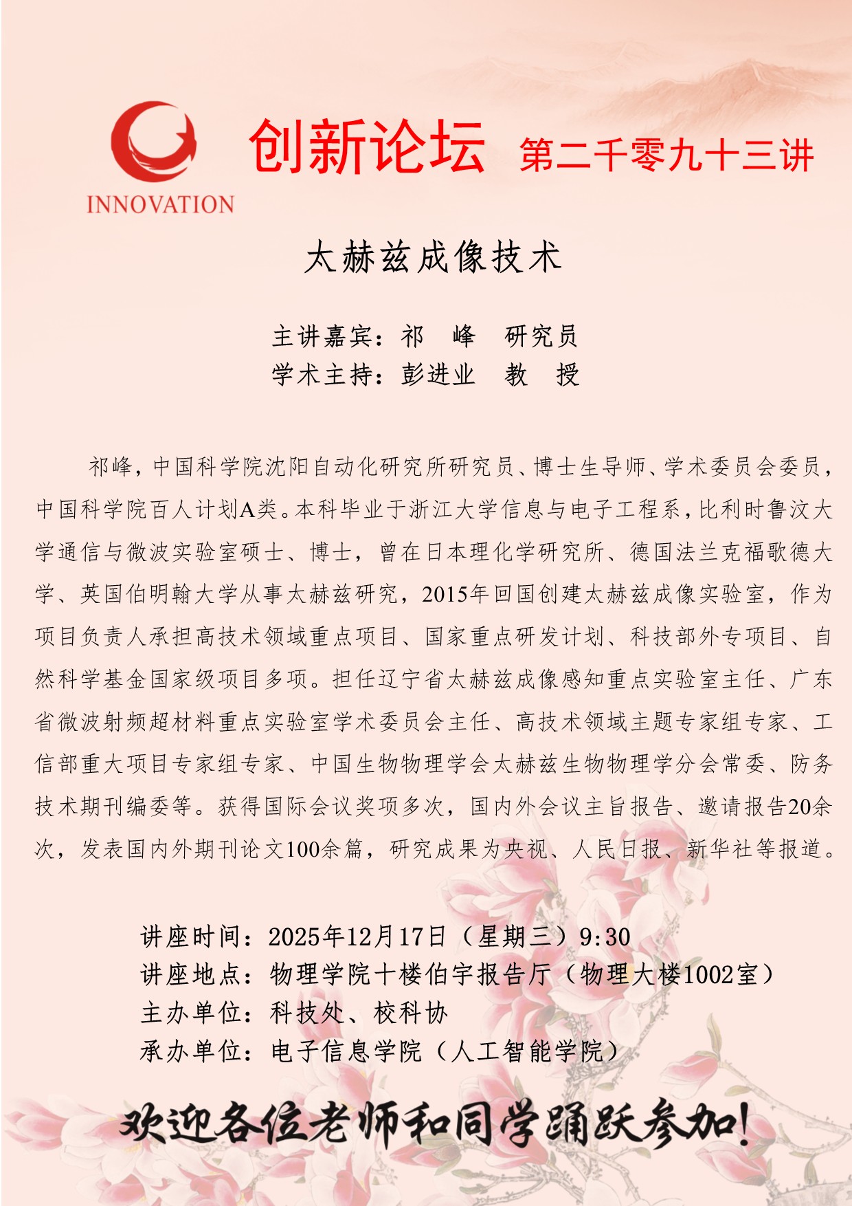 祁峰 研究员 天空(中国)创新论坛第二千零九十三讲:太赫兹成像技术 讲座时间 2025年12月17日(星期三)9:30 讲座地点 物理学院十楼伯宇报告厅(物理大楼1002室) 讲座人介绍 祁峰 研究员 讲座内容