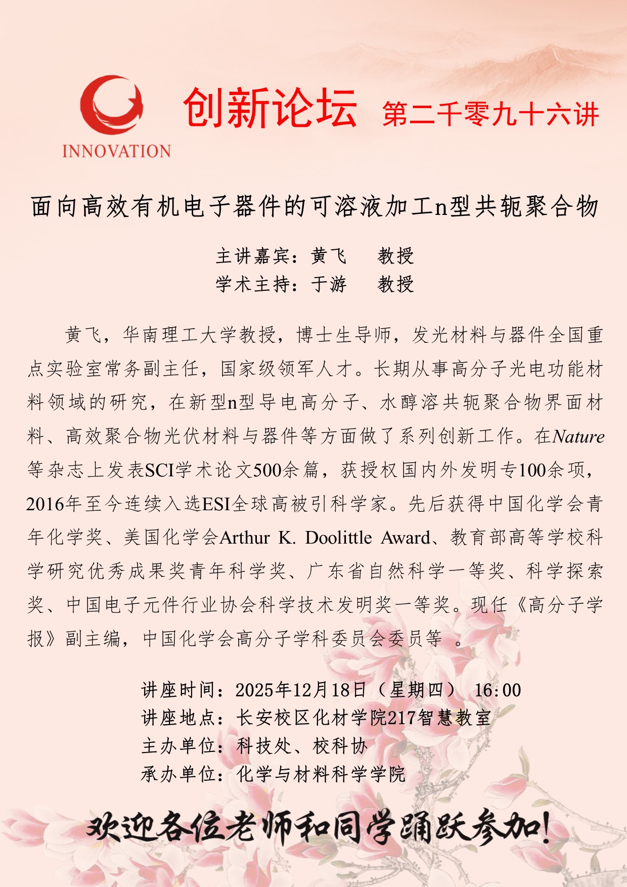 黄飞 教授 天空(中国)创新论坛第二千零九十六讲:面向高效有机电子器件的可溶液加工n型共轭聚合物 讲座时间 2025年12月18日(星期四) 16:00 讲座地点 长安校区化材学院217智慧教室 讲座人介绍 黄飞 教授 讲座内容