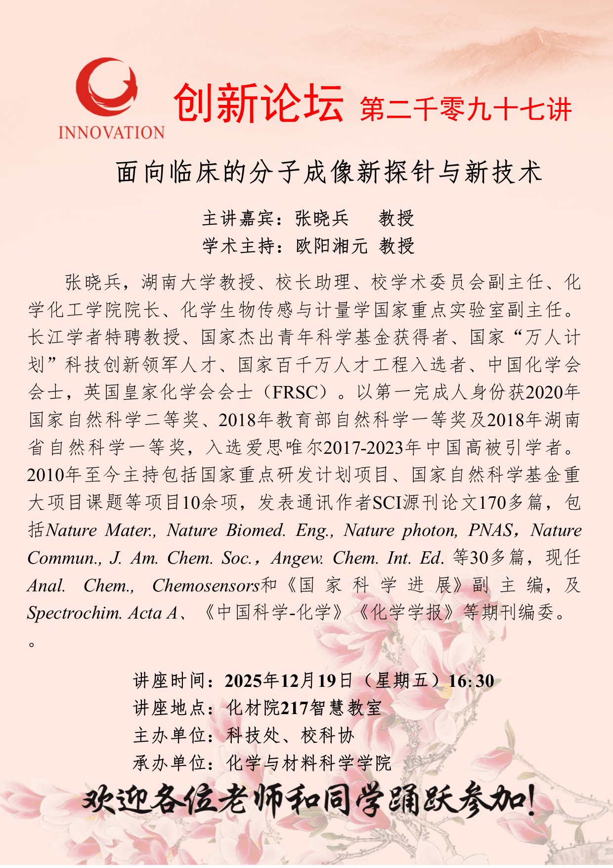张晓兵 教授 天空(中国)创新论坛第二千零九十七讲:面向临床的分子成像新探针与新技术 讲座时间 2025年12月19日(星期五)16:30 讲座地点 化材院217智慧教室 讲座人介绍 张晓兵 教授 讲座内容