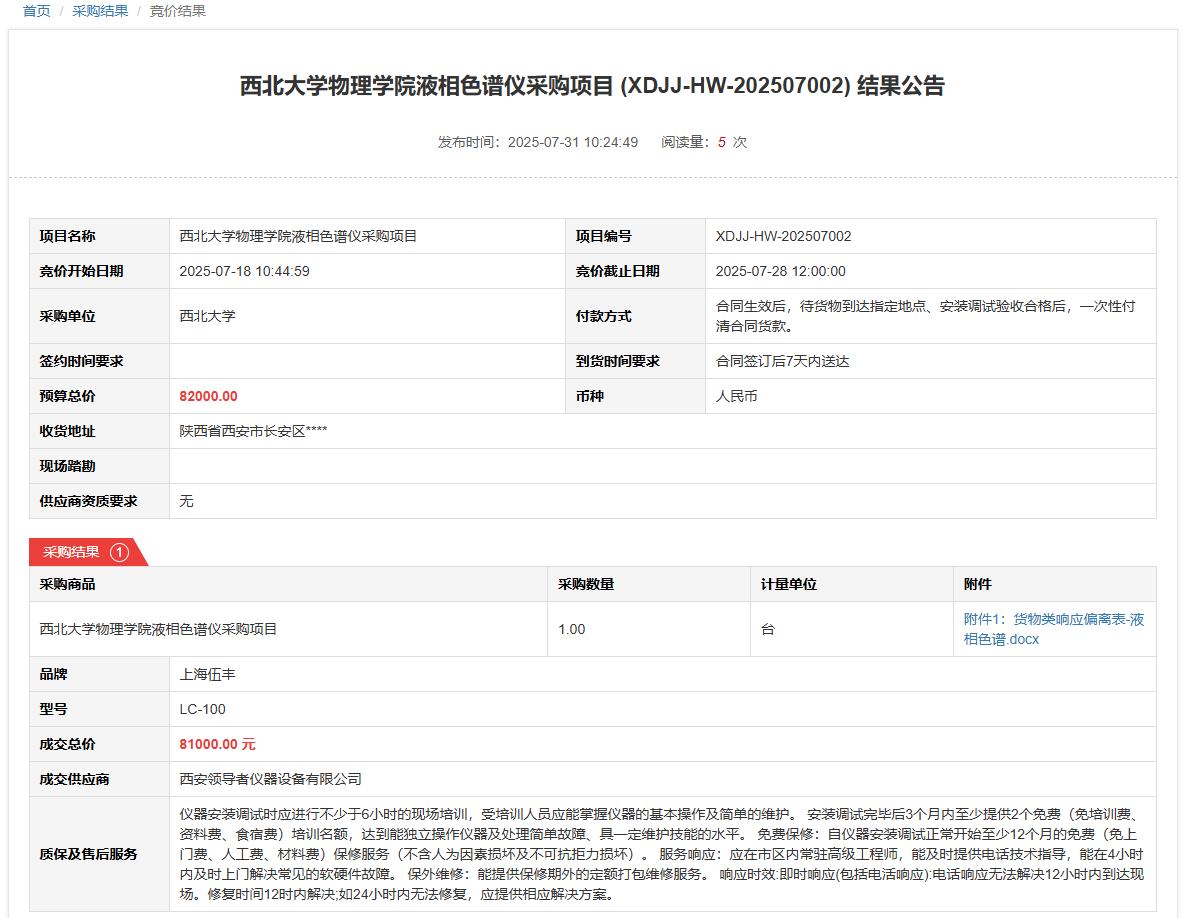 天空(中国)物理学院液相色谱仪采购项目(XDJJ-HW-202507002)竞价结果公告