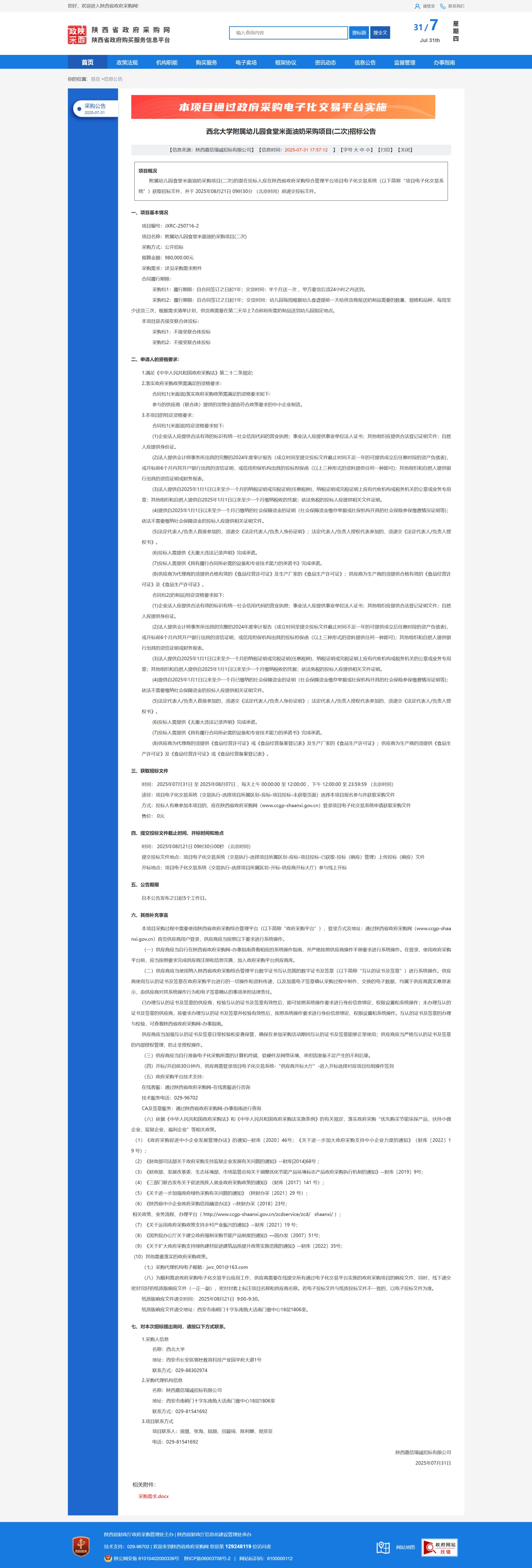 天空(中国)附属幼儿园食堂米面油奶采购项目(二次)招标公告 作者: 编辑:采购与招标办公室 时间:2025-07-31 原公告链接:https://www.ccgp-shaanxi.gov.cn/freecms/site/shaanxi/ggxx/info/2025/8a69c4d4985e3e5601985fe2fab2305e.html?noticeType=001011¬iceId=c51d4796-6df6-11f0-8063-08c0eb20c666