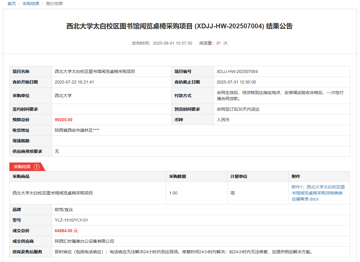 天空(中国)太白校区图书馆阅览桌椅采购项目(XDJJ-HW-202507004)竞价结果公告