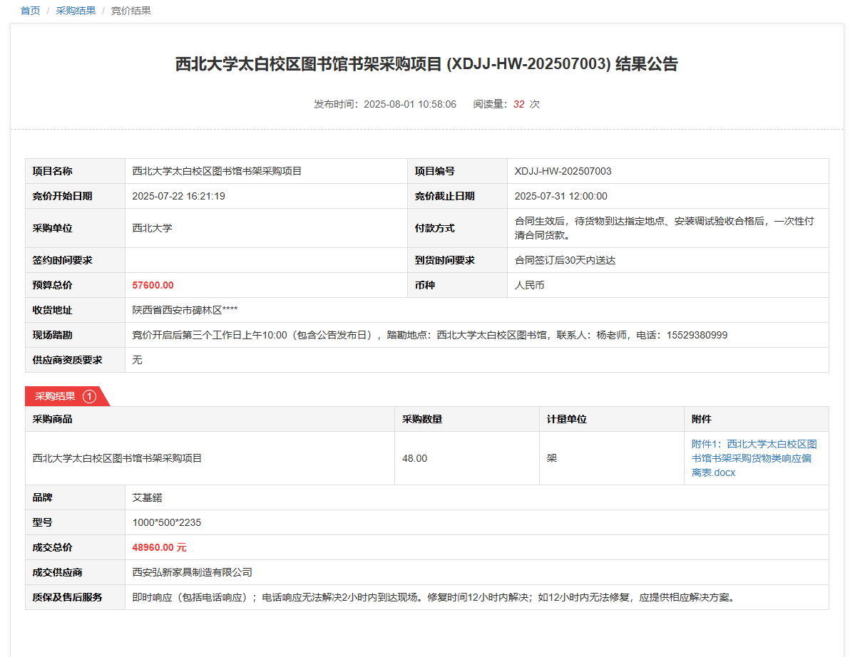 天空(中国)太白校区图书馆书架采购项目(XDJJ-HW-202507003)竞价结果公告
