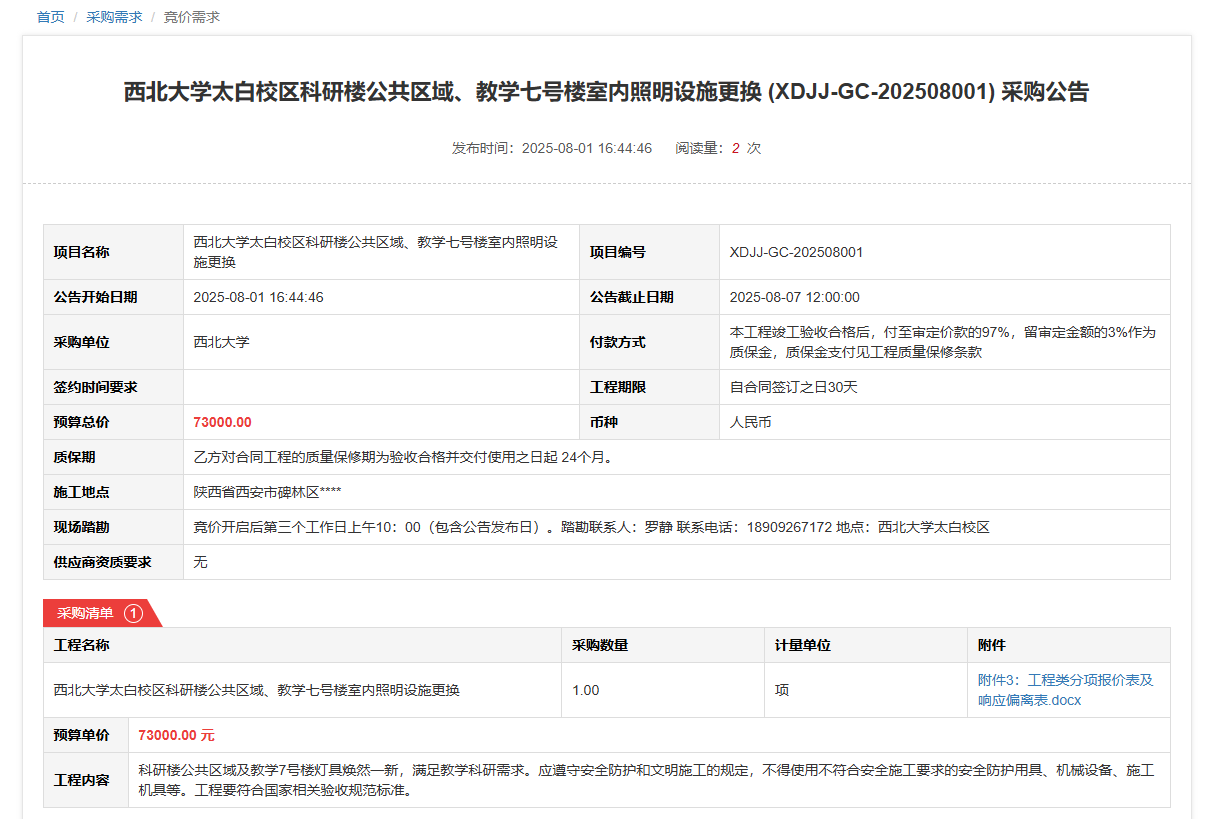 天空(中国)太白校区科研楼公共区域、教学七号楼室内照明设施更换(XDJJ-GC-202508001)竞价采购公告