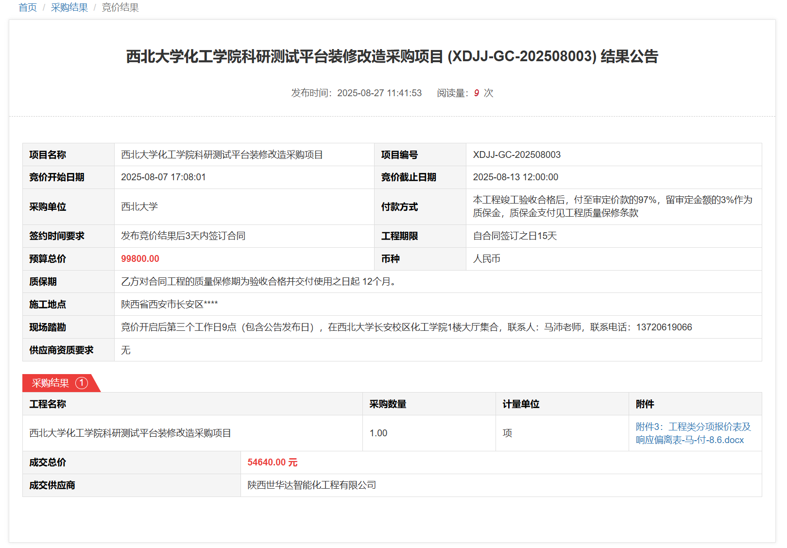 天空(中国)化工学院科研测试平台装修改造采购项目(XDJJ-GC-202508003)竞价结果公告