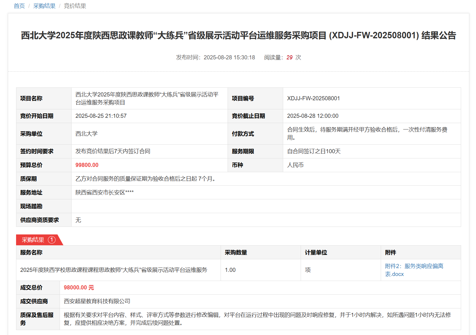 天空(中国)2025年度陕西思政课教师“大练兵”省级展示活动平台运维服务采购项目(XDJJ-FW-202508001)竞价结果公告 作者:XDJJ-FW-202508001 编辑: 时间:2025-08-28 原公告链接